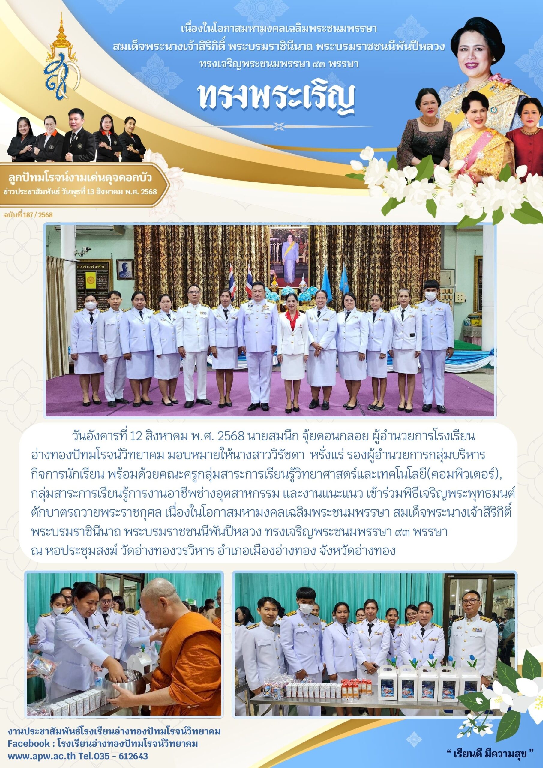 วันอังคารที่ 12 สิงหาคม พ.ศ. 2568 นายสมนึก จุ้ยดอนกลอย ผู้อำนวยการโรงเรียนอ่างทองปัทมโรจน์วิทยาคม มอบหมายให้นางสาววิรัชดา หรั่งแร่ รองผู้อำนวยการกลุ่มบริหารกิจการนักเรียน พร้อมด้วยคณะครูกลุ่มสาระการเรียนรู้วิทยาศาสตร์และเทคโนโลยี(คอมพิวเตอร์), กลุ่มสาระการเรียนรู้การงานอาชีพช่างอุตสาหกรรม และงานแนะแนว เข้าร่วมพิธีเจริญพระพุทธมนต์ ตักบาตรถวายพระราชกุศล เนื่องในโอกาสมหามงคลเฉลิมพระชนมพรรษา สมเด็จพระนางเจ้าสิริกิติ์ พระบรมราชินีนาถ พระบรมราชชนนีพันปีหลวง ทรงเจริญพระชนมพรรษา ๙๓ พรรษา ณ หอประชุมสงฆ์ วัดอ่างทองวรวิหาร อำเภอเมืองอ่างทอง จังหวัดอ่างทอง