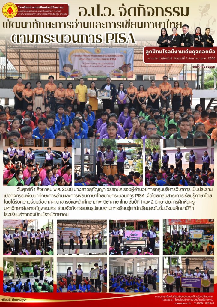วันศุกร์ที่ 1 สิงหาคม พ.ศ. 2568 นางสาวสุกัญญา วรรณโส รองผู้อำนวยการกลุ่มบริหารวิชาการ เป็นประธานเปิดกิจกรรมพัฒนาทักษะการอ่านและการเขียนภาษาไทยตามกระบวนการ PISA จัดโดยกลุ่มสาระการเรียนรู้ภาษาไทยโดยได้รับความร่วมมือจากคณาจารย์และนักศึกษาสาขาวิชาภาษาไทย ชั้นปีที่ 1 และ 2 วิทยาลัยการฝึกหัดครู มหาวิทยาลัยราชภัฏพระนคร ร่วมจัดกิจกรรมในรูปแบบฐานการเรียนรู้แก่นักเรียนระดับชั้นมัธยมศึกษาปีที่ 1 โรงเรียนอ่างทองปัทมโรจน์วิทยาคม