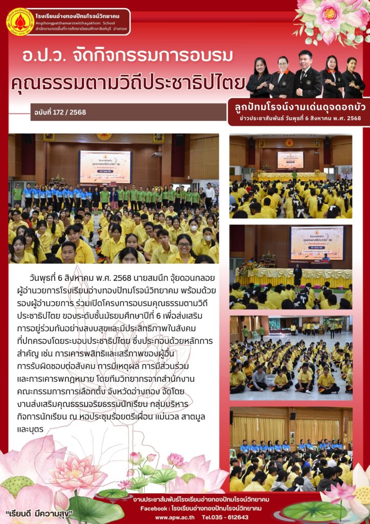 วันพุธที่ 6 สิงหาคม พ.ศ. 2568 นายสมนึก จุ้ยดอนกลอย ผู้อำนวยการโรงเรียนอ่างทองปัทมโรจน์วิทยาคม พร้อมด้วยรองผู้อำนวยการ ร่วมเปิดโครงการอบรมคุณธรรมตามวิถีประชาธิปไตย ของระดับชั้นมัธยมศึกษาปีที่ 6 เพื่อส่งเสริมการอยู่ร่วมกันอย่างสงบสุขและมีประสิทธิภาพในสังคมที่ปกครองโดยระบอบประชาธิปไตย ซึ่งประกอบด้วยหลักการสำคัญ เช่น การเคารพสิทธิและเสรีภาพของผู้อื่นการรับผิดชอบต่อสังคม การมีเหตุผล การมีส่วนร่วมและการเคารพกฎหมาย โดยทีมวิทยากรจากสำนักงานคณะกรรมการการเลือกตั้ง จังหวัดอ่างทอง จัดโดยงานส่งเสริมคุณธรรมจริยธรรมนักเรียน กลุ่มบริหารกิจการนักเรียน ณ หอประชุมร้อยตรีเผื่อน แม่นวล สาตมูล และบุตร