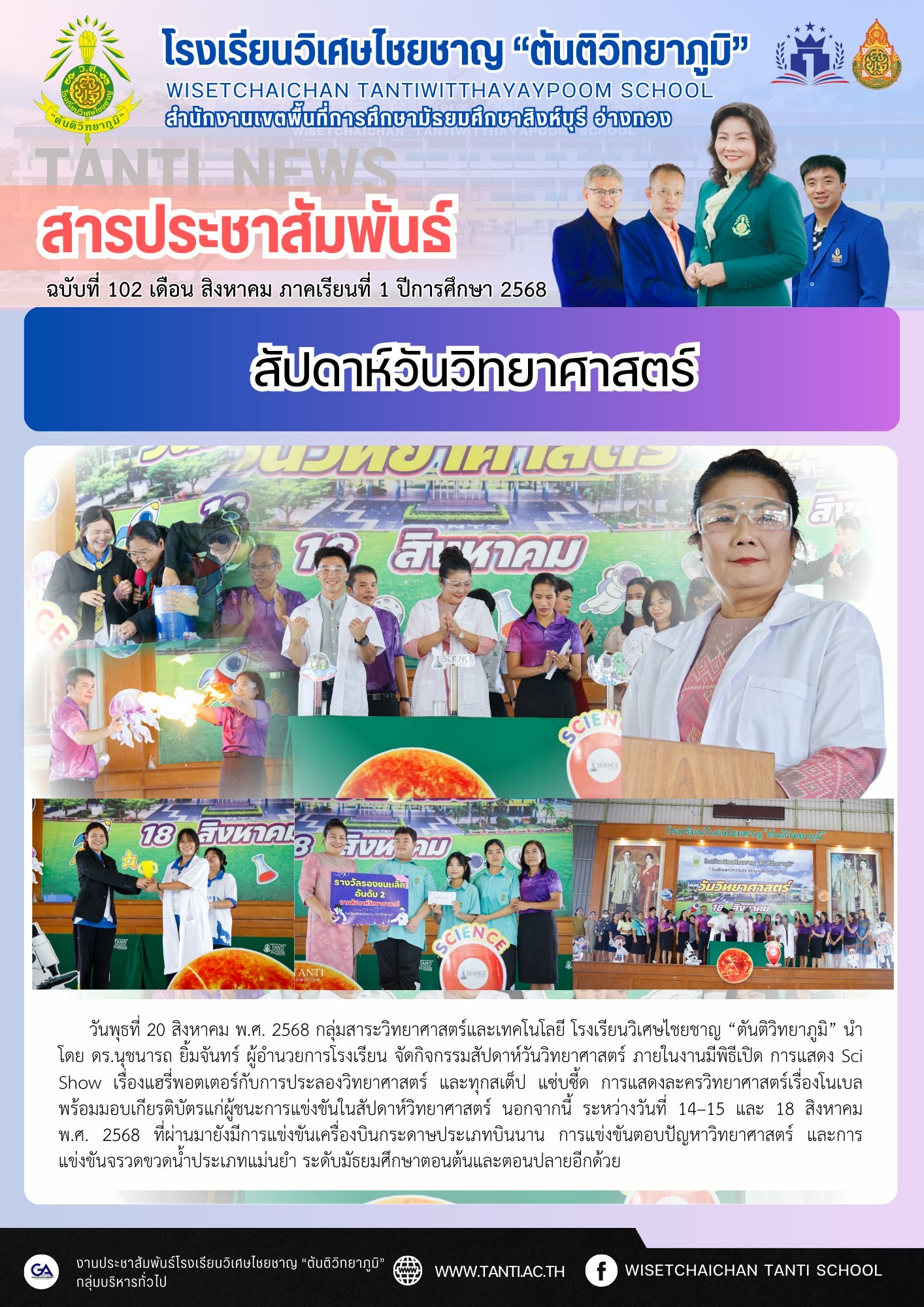 วันพุธที่ 20 สิงหาคม พ.ศ. 2568 กลุ่มสาระวิทยาศาสตร์และเทคโนโลยี โรงเรียนวิเศษไชยชาญ “ตันติวิทยาภูมิ” นำโดย ดร.นุชนารถ ยิ้มจันทร์ ผู้อำนวยการโรงเรียน จัดกิจกรรมสัปดาห์วันวิทยาศาสตร์ ภายในงานมีพิธีเปิด การแสดง Sci Show เรื่องแฮรี่พอตเตอร์กับการประลองวิทยาศาสตร์ และทุกสเต็ป แซ่บซี้ด การแสดงละครวิทยาศาสตร์เรื่องโนเบล พร้อมมอบเกียรติบัตรแก่ผู้ชนะการแข่งขันในสัปดาห์วิทยาศาสตร์ นอกจากนี้ ระหว่างวันที่ 14–15 และ 18 สิงหาคม พ.ศ. 2568 ที่ผ่านมายังมีการแข่งขันเครื่องบินกระดาษประเภทบินนาน การแข่งขันตอบปัญหาวิทยาศาสตร์ และการแข่งขันจรวดขวดน้ำประเภทแม่นยำ ระดับมัธยมศึกษาตอนต้นและตอนปลายอีกด้วย