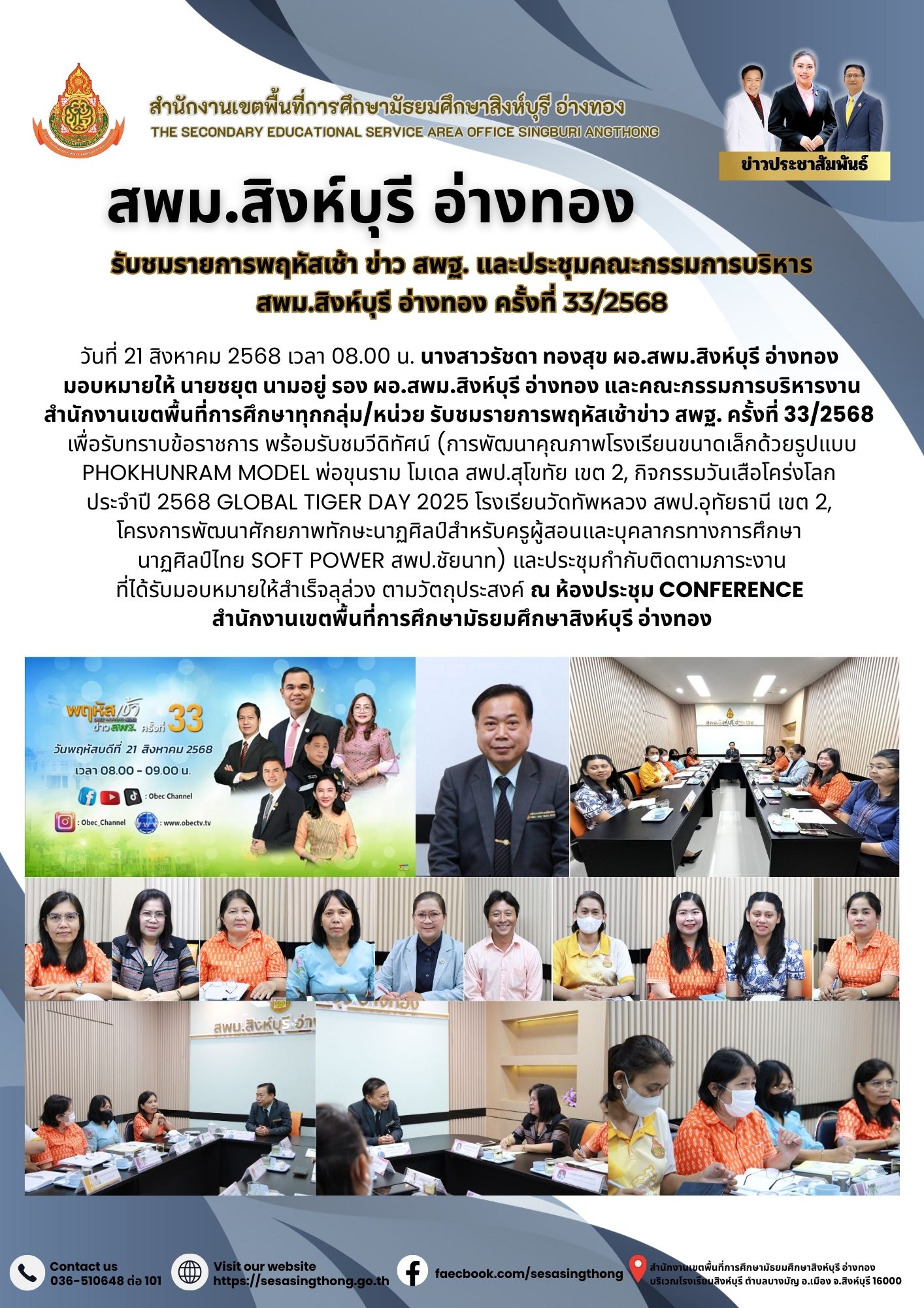 รับชมรายการพฤหัสเช้า ข่าว สพฐ. และประชุมคณะกรรมการบริหาร สพม.สิงห์บุรี อ่างทอง ครั้งที่ 33/2568
