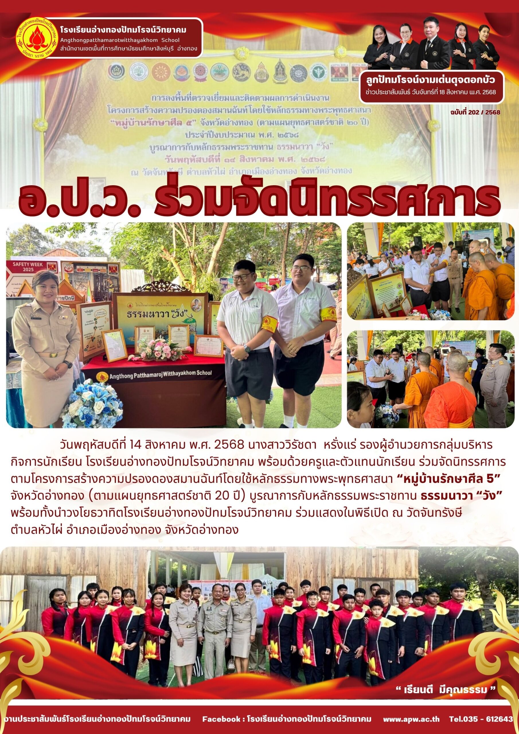 วันพฤหัสบดีที่ 14 สิงหาคม พ.ศ. 2568 นางสาววิรัชดา หรั่งแร่ รองผู้อำนวยการกลุ่มบริหารกิจการนักเรียน โรงเรียนอ่างทองปัทมโรจน์วิทยาคม พร้อมด้วยครูและตัวแทนนักเรียน ร่วมจัดนิทรรศการตามโครงการสร้างความปรองดองสมานฉันท์โดยใช้หลักธรรมทางพระพุทธศาสนา “หมู่บ้านรักษาศีล 5” จังหวัดอ่างทอง (ตามแผนยุทธศาสตร์ชาติ 20 ปี) บูรณาการกับหลักธรรมพระราชทาน ธรรมนาวา “วัง”พร้อมทั้งนำวงโยธวาทิตโรงเรียนอ่างทองปัทมโรจน์วิทยาคม ร่วมแสดงในพิธีเปิด ณ วัดจันทรังษี ตำบลหัวไผ่ อำเภอเมืองอ่างทอง จังหวัดอ่างทอง