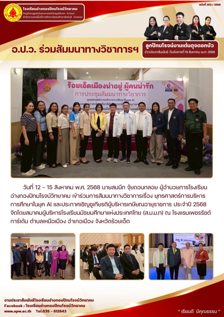 วันที่ 12 – 15 สิงหาคม พ.ศ. 2568 นายสมนึก จุ้ยดอนกลอย ผู้อำนวยการโรงเรียนอ่างทองปัทมโรจน์วิทยาคม เข้าร่วมการสัมมนาทางวิชาการเรื่อง ยุทธศาสตร์การบริหารการศึกษาในยุค AI และประกาศเชิญชูเกียรติผู้บริหารเกษียณอายุราชการ ประจำปี 2568 จัดโดยสมาคมผู้บริหารโรงเรียนมัธยมศึกษาแห่งประเทศไทย (ส.บ.ม.ท) ณ โรงแรมเพชรรัชต์การ์เด้น ตำบลเหนือเมือง อำเภอเมือง จังหวัดร้อยเอ็ด