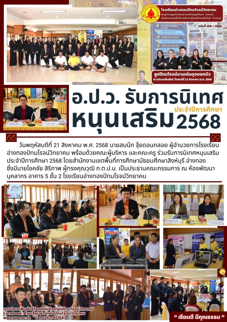 วันพฤหัสบดีที่ 21 สิงหาคม พ.ศ. 2568 นายสมนึก จุ้ยดอนกลอย ผู้อำนวยการโรงเรียนอ่างทองปัทมโรจน์วิทยาคม พร้อมด้วยคณะผู้บริหาร และคณะครู ร่วมรับการนิเทศหนุนเสริม ประจำปีการศึกษา 2568 โดยสำนักงานเขตพื้นที่การศึกษามัธยมศึกษาสิงห์บุรี อ่างทองซึ่งมีนายโชคชัย สิริภาพ ผู้ทรงคุณวุฒิ ก.ต.ป.น. เป็นประธานคณะกรรมการ ณ ห้องพัฒนาบุคลากร อาคาร 5 ชั้น 2 โรงเรียนอ่างทองปัทมโรจน์วิทยาคม