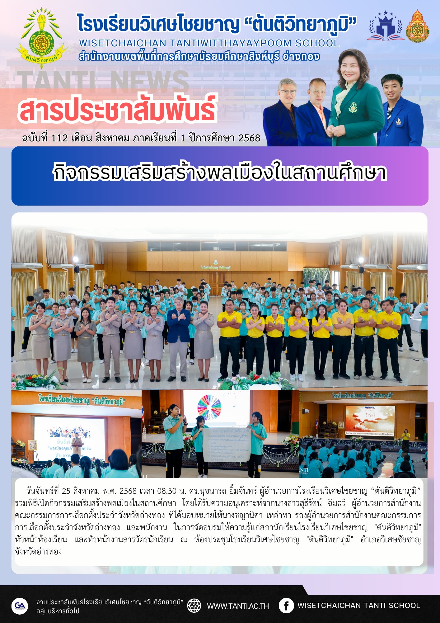 วันจันทร์ที่ 25 สิงหาคม พ.ศ. 2568 เวลา 08.30 น. ดร.นุชนารถ ยิ้มจันทร์ ผู้อำนวยการโรงเรียนวิเศษไชยชาญ “ตันติวิทยาภูมิ” ร่วมพิธีเปิดกิจกรรมเสริมสร้างพลเมืองในสถานศึกษา โดยได้รับความอนุเคราะห์จากนางสาวสุธีรัตน์ ฉิมฉวี ผู้อำนวยการสำนักงานคณะกรรมการการเลือกตั้งประจำจังหวัดอ่างทอง ที่ได้มอบหมายให้นางชญานิศา เหล่าทา รองผู้อำนวยการสำนักงานคณะกรรมการการเลือกตั้งประจำจังหวัดอ่างทอง และพนักงาน ในการจัดอบรมให้ความรู้แก่สภานักเรียนโรงเรียนวิเศษไชยชาญ “ตันติวิทยาภูมิ” หัวหน้าห้องเรียน และหัวหน้างานสารวัตรนักเรียน ณ ห้องประชุมโรงเรียนวิเศษไชยชาญ “ตันติวิทยาภูมิ” อำเภอวิเศษชัยชาญ จังหวัดอ่างทอง