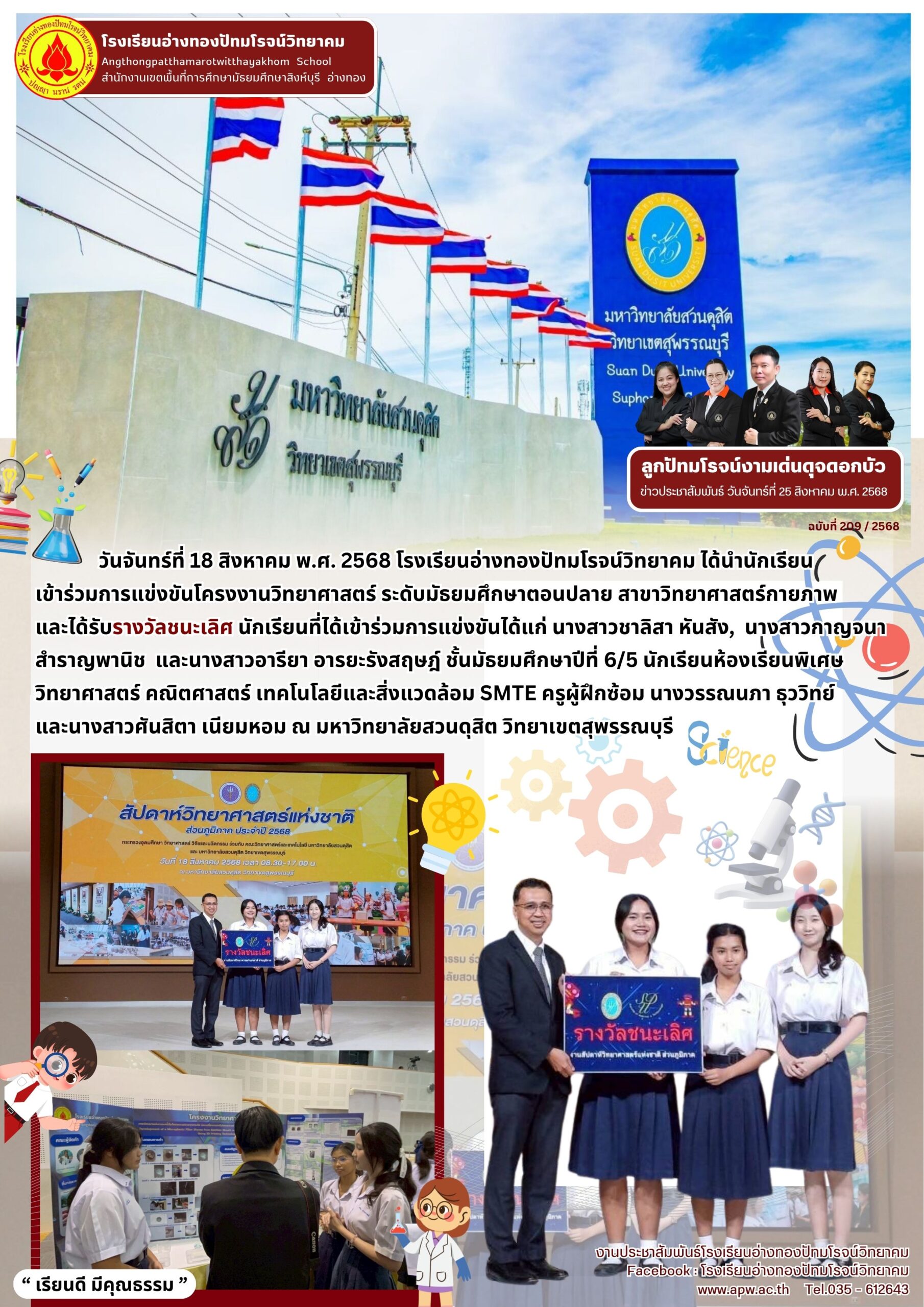 วันจันทร์ที่ 18 สิงหาคม พ.ศ. 2568 โรงเรียนอ่างทองปัทมโรจน์วิทยาคม ได้นำนักเรียนเข้าร่วมการแข่งขันโครงงานวิทยาศาสตร์ ระดับมัธยมศึกษาตอนปลาย สาขาวิทยาศาสตร์กายภาพและได้รับรางวัลชนะเลิศ นักเรียนที่ได้เข้าร่วมการแข่งขันได้แก่ นางสาวชาลิสา หันสัง, นางสาวกาญจนา สำราญพานิช และนางสาวอารียา อารยะรังสฤษฎ์ ชั้นมัธยมศึกษาปีที่ 6/5 นักเรียนห้องเรียนพิเศษวิทยาศาสตร์ คณิตศาสตร์ เทคโนโลยีและสิ่งแวดล้อม SMTE ครูผู้ฝึกซ้อม นางวรรณนภา ธุววิทย์และนางสาวศันสิตา เนียมหอม ณ มหาวิทยาลัยสวนดุสิต วิทยาเขตสุพรรณบุรี