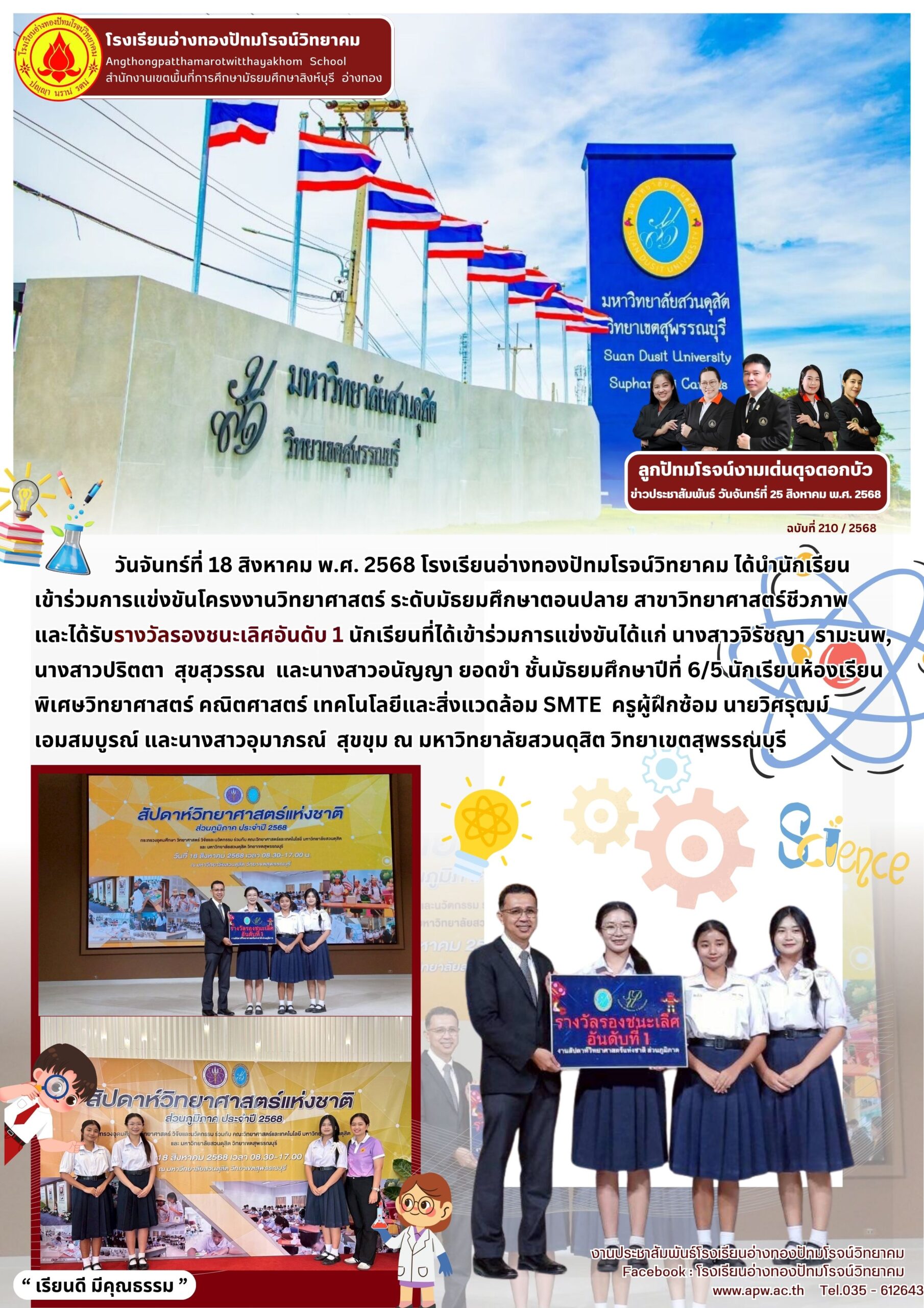 วันจันทร์ที่ 18 สิงหาคม พ.ศ. 2568 โรงเรียนอ่างทองปัทมโรจน์วิทยาคม ได้นำนักเรียนเข้าร่วมการแข่งขันโครงงานวิทยาศาสตร์ ระดับมัธยมศึกษาตอนปลาย สาขาวิทยาศาสตร์ชีวภาพและได้รับรางวัลรองชนะเลิศอันดับ 1 นักเรียนที่ได้เข้าร่วมการแข่งขันได้แก่ นางสาวจิรัชญา รามะนพ, นางสาวปริตตา สุขสุวรรณ และนางสาวอนัญญา ยอดขำ ชั้นมัธยมศึกษาปีที่ 6/5 นักเรียนห้องเรียนพิเศษวิทยาศาสตร์ คณิตศาสตร์ เทคโนโลยีและสิ่งแวดล้อม SMTE ครูผู้ฝึกซ้อม นายวิศรุฒม์ เอมสมบูรณ์ และนางสาวอุมาภรณ์ สุขขุม ณ มหาวิทยาลัยสวนดุสิต วิทยาเขตสุพรรณบุรี