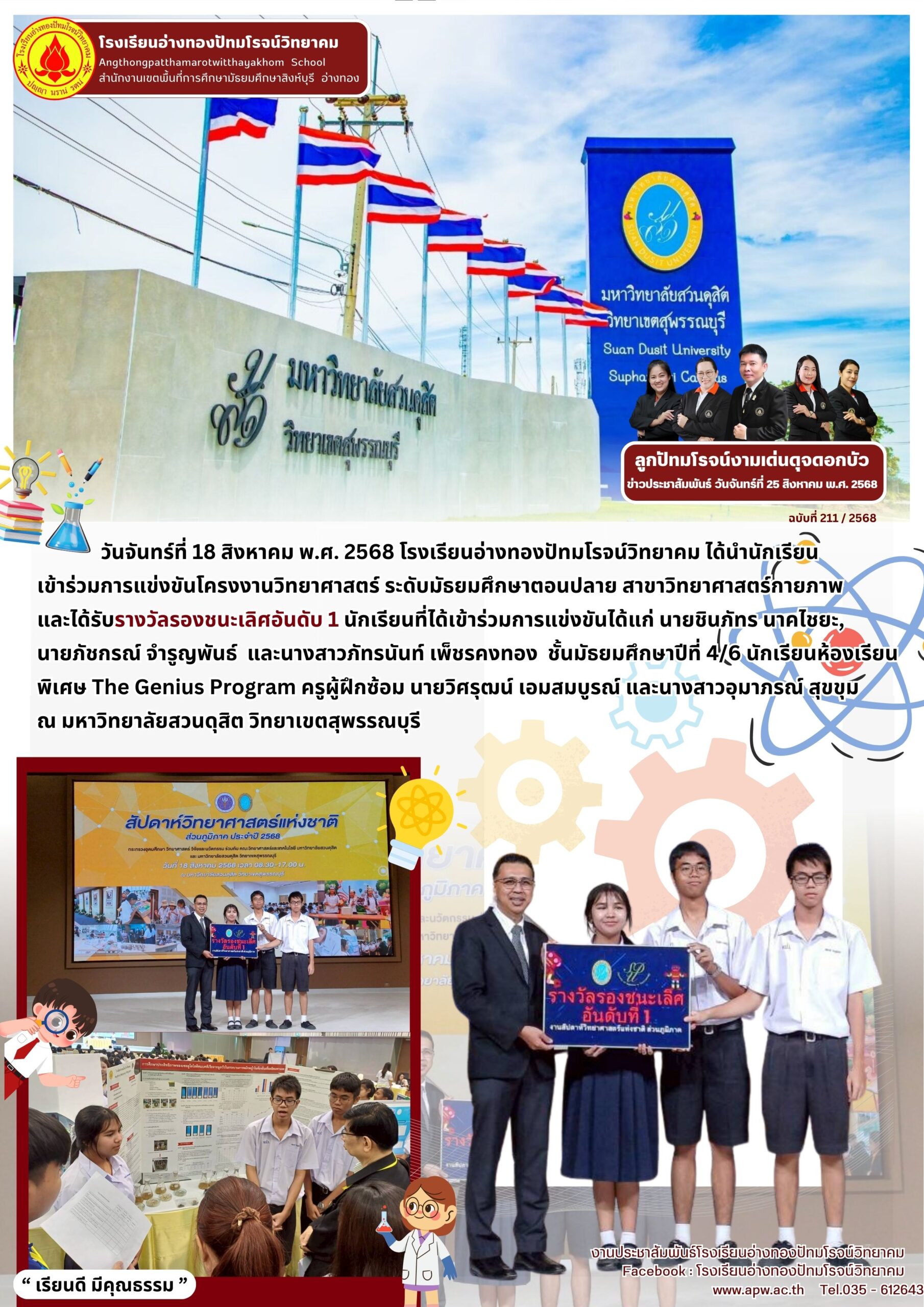 วันจันทร์ที่ 18 สิงหาคม พ.ศ. 2568 โรงเรียนอ่างทองปัทมโรจน์วิทยาคม ได้นำนักเรียนเข้าร่วมการแข่งขันโครงงานวิทยาศาสตร์ ระดับมัธยมศึกษาตอนปลาย สาขาวิทยาศาสตร์กายภาพและได้รับรางวัลรองชนะเลิศอันดับ 1 นักเรียนที่ได้เข้าร่วมการแข่งขันได้แก่ นายชินภัทร นาคไชยะ, นายภัชกรณ์ จำรูญพันธ์ และนางสาวภัทรนันท์ เพ็ชรคงทอง ชั้นมัธยมศึกษาปีที่ 4/6 นักเรียนห้องเรียนพิเศษ The Genius Program ครูผู้ฝึกซ้อม นายวิศรุฒน์ เอมสมบูรณ์ และนางสาวอุมาภรณ์ สุขขุม ณ มหาวิทยาลัยสวนดุสิต วิทยาเขตสุพรรณบุรี