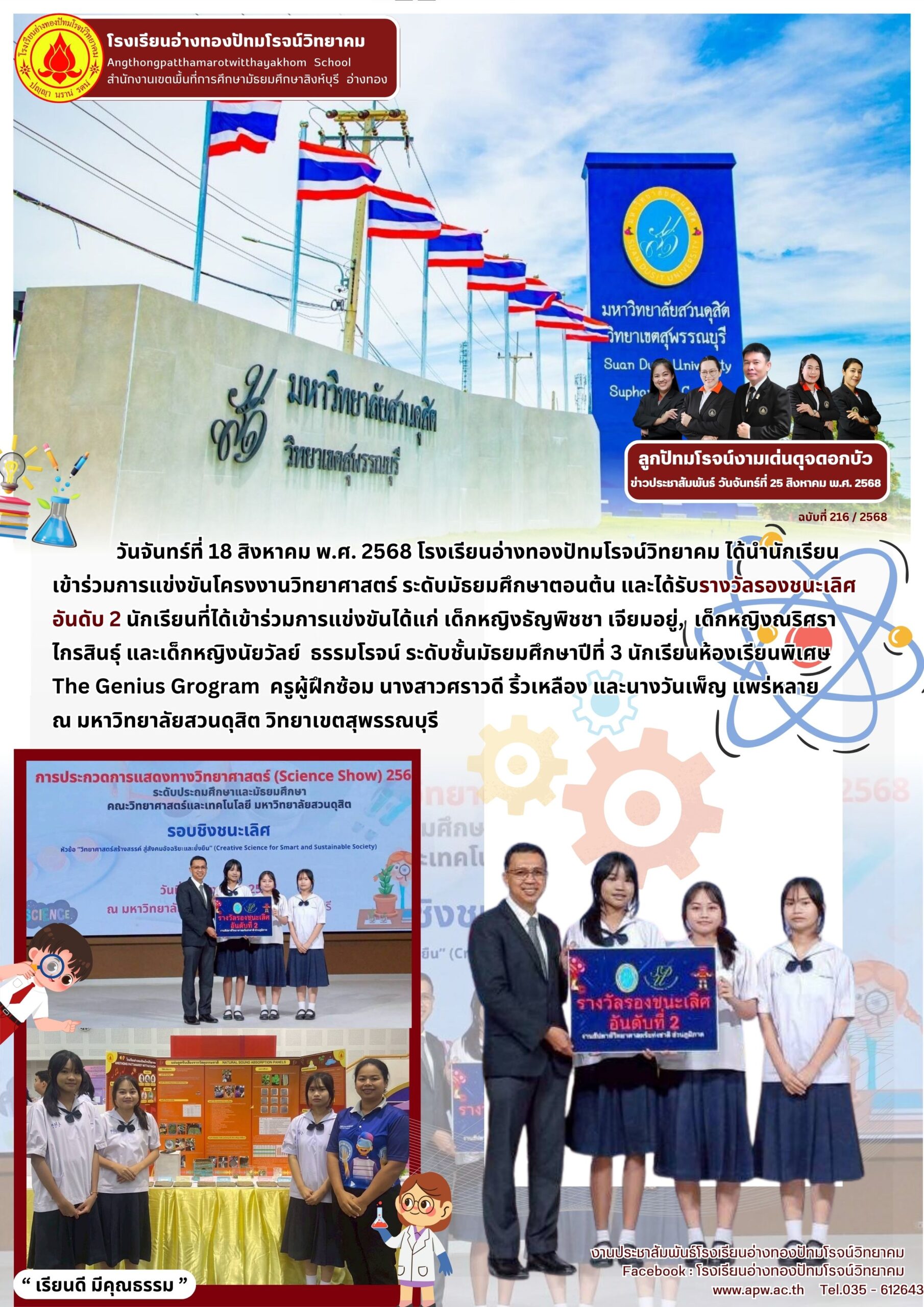 วันจันทร์ที่ 18 สิงหาคม พ.ศ. 2568 โรงเรียนอ่างทองปัทมโรจน์วิทยาคม ได้นำนักเรียนเข้าร่วมการแข่งขันโครงงานวิทยาศาสตร์ ระดับมัธยมศึกษาตอนต้น และได้รับรางวัลรองชนะเลิศอันดับ 2 นักเรียนที่ได้เข้าร่วมการแข่งขันได้แก่ เด็กหญิงธัญพิชชา เจียมอยู่, เด็กหญิงณริศรา ไกรสินธุ์ และเด็กหญิงนัยวัลย์ ธรรมโรจน์ ระดับชั้นมัธยมศึกษาปีที่ 3 นักเรียนห้องเรียนพิเศษ The Genius Grogram ครูผู้ฝึกซ้อม นางสาวศราวดี ริ้วเหลือง และนางวันเพ็ญ แพร่หลาย ณ มหาวิทยาลัยสวนดุสิต วิทยาเขตสุพรรณบุรี