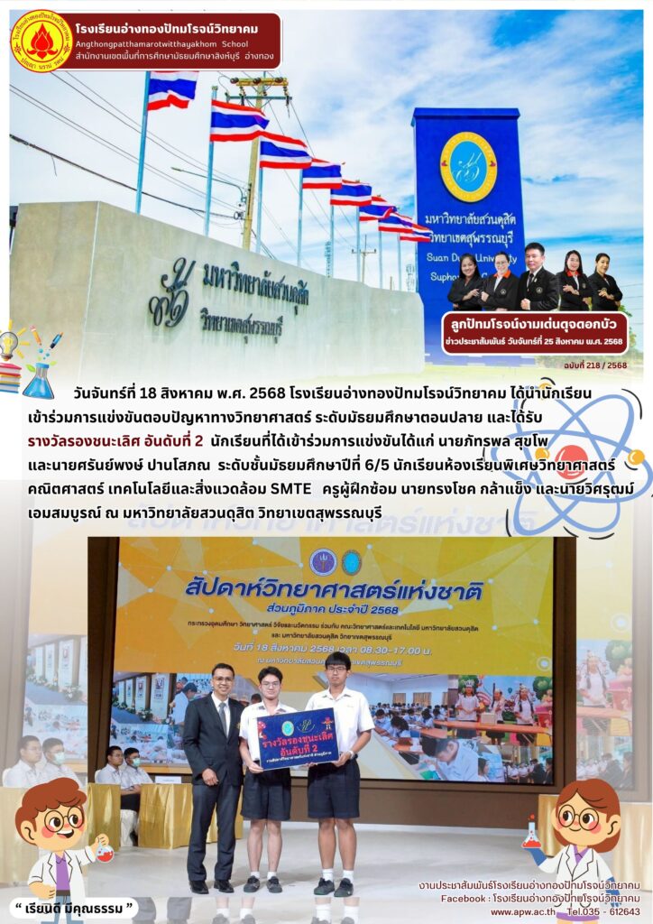 วันจันทร์ที่ 18 สิงหาคม พ.ศ. 2568 โรงเรียนอ่างทองปัทมโรจน์วิทยาคม ได้นำนักเรียนเข้าร่วมการแข่งขันตอบปัญหาทางวิทยาศาสตร์ ระดับมัธยมศึกษาตอนปลาย และได้รับรางวัลรองชนะเลิศ อันดับที่ 2 นักเรียนที่ได้เข้าร่วมการแข่งขันได้แก่ นายภัทรพล สุขโพ และนายศรันย์พงษ์ ปานโสภณ ระดับชั้นมัธยมศึกษาปีที่ 6/5 นักเรียนห้องเรียนพิเศษวิทยาศาสตร์ คณิตศาสตร์ เทคโนโลยีและสิ่งแวดล้อม SMTE ครูผู้ฝึกซ้อม นายทรงโชค กล้าแข็ง และนายวิศรุฒม์ เอมสมบูรณ์ ณ มหาวิทยาลัยสวนดุสิต วิทยาเขตสุพรรณบุรี