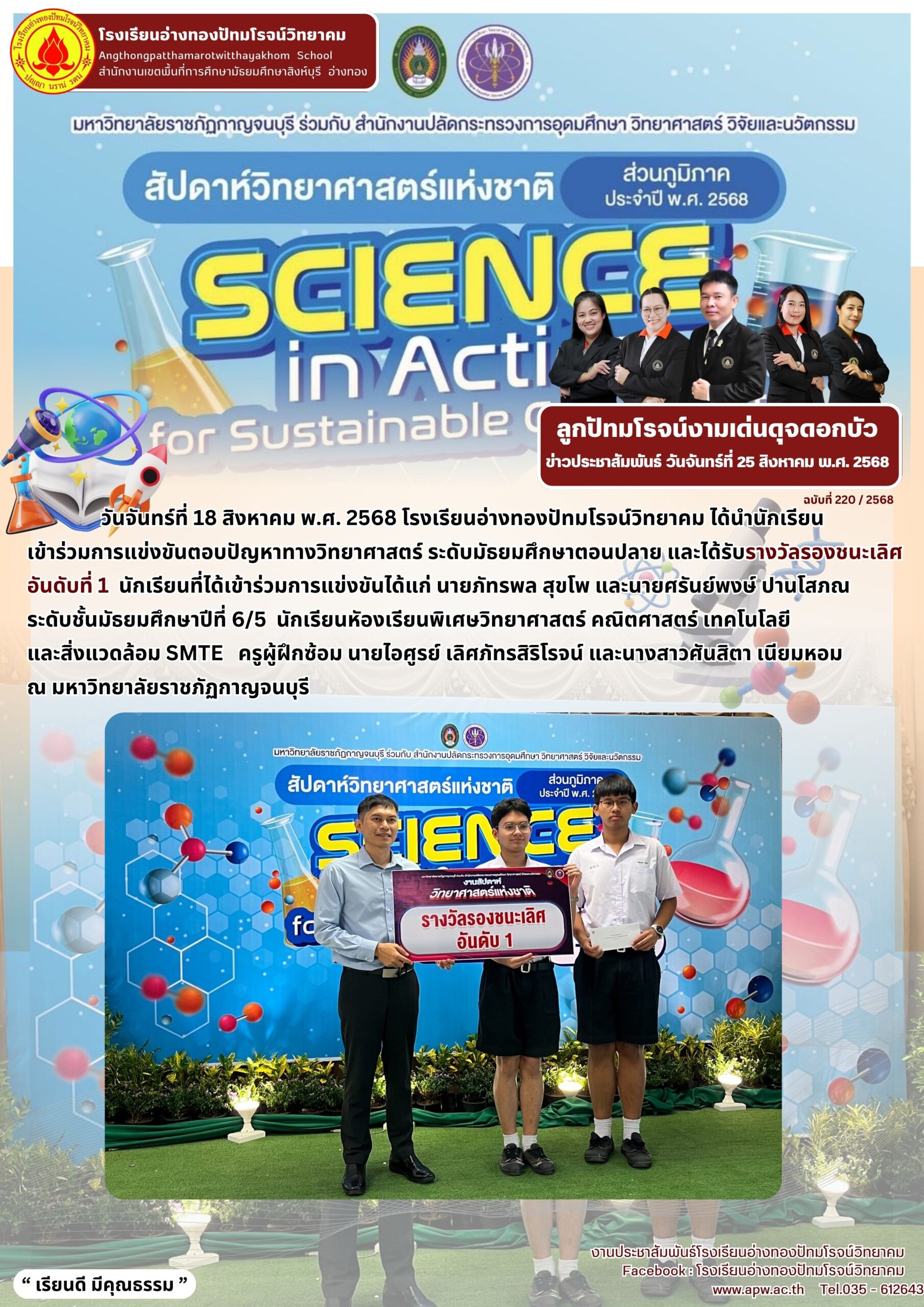 วันจันทร์ที่ 18 สิงหาคม พ.ศ. 2568 โรงเรียนอ่างทองปัทมโรจน์วิทยาคม ได้นำนักเรียนเข้าร่วมการแข่งขันตอบปัญหาทางวิทยาศาสตร์ ระดับมัธยมศึกษาตอนปลาย และได้รับรางวัลรองชนะเลิศ อันดับที่ 1 นักเรียนที่ได้เข้าร่วมการแข่งขันได้แก่ นายภัทรพล สุขโพ และนายศรันย์พงษ์ ปานโสภณ ระดับชั้นมัธยมศึกษาปีที่ 6/5 นักเรียนหัองเรียนพิเศษวิทยาศาสตร์ คณิตศาสตร์ เทคโนโลยี และสิ่งแวดล้อม SMTE ครูผู้ฝึกซ้อม นายไอศูรย์ เลิศภัทรสิริโรจน์ และนางสาวศันสิตา เนียมหอม ณ มหาวิทยาลัยราชภัฏกาญจนบุรี