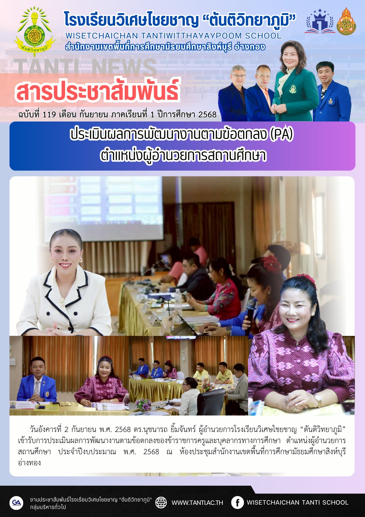 วันอังคารที่ 2 กันยายน พ.ศ. 2568 ดร.นุชนารถ ยิ้มจันทร์ ผู้อำนวยการโรงเรียนวิเศษไชยชาญ “ตันติวิทยาภูมิ” เข้ารับการประเมินผลการพัฒนางานตามข้อตกลงของข้าราชการครูและบุคลากรทางการศึกษา ตำแหน่งผู้อำนวยการสถานศึกษา ประจำปีงบประมาณ พ.ศ. 2568 ณ ห้องประชุมสำนักงานเขตพื้นที่การศึกษามัธยมศึกษาสิงห์บุรี อ่างทอง