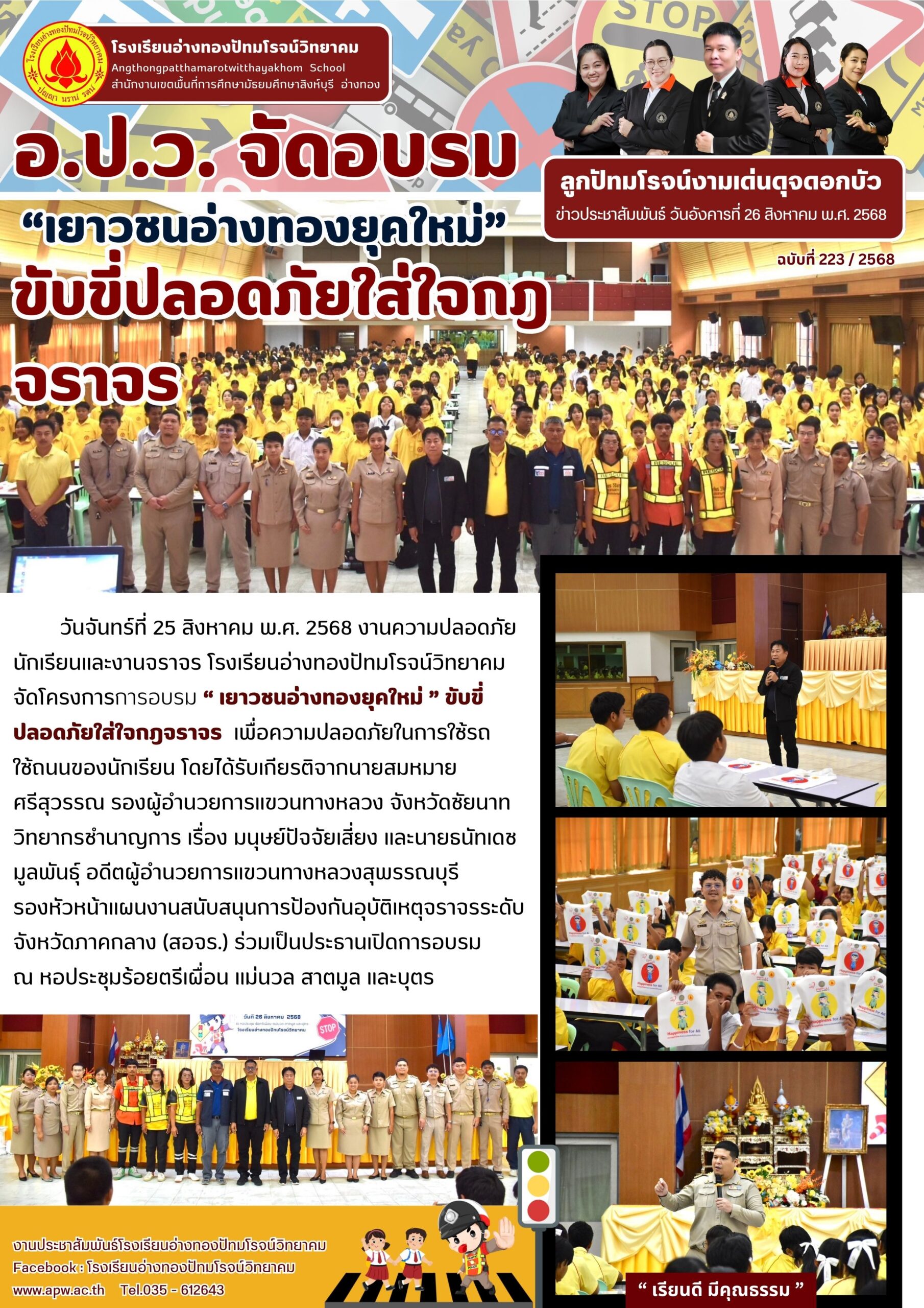 วันจันทร์ที่ 25 สิงหาคม พ.ศ. 2568 งานความปลอดภัยนักเรียนและงานจราจร โรงเรียนอ่างทองปัทมโรจน์วิทยาคมจัดโครงการการอบรม “ เยาวชนอ่างทองยุคใหม่ ” ขับขี่ปลอดภัยใส่ใจกฎจราจร เพื่อความปลอดภัยในการใช้รถใช้ถนนของนักเรียน โดยได้รับเกียรติจากนายสมหมาย ศรีสุวรรณ รองผู้อำนวยการแขวนทางหลวง จังหวัดชัยนาท วิทยากรชำนาญการ เรื่อง มนุษย์ปัจจัยเสี่ยง และนายธนัทเดช มูลพันธุ์ อดีตผู้อำนวยการแขวนทางหลวงสุพรรณบุรี รองหัวหน้าแผนงานสนับสนุนการป้องกันอุบัติเหตุจราจรระดับจังหวัดภาคกลาง (สอจร.) ร่วมเป็นประธานเปิดการอบรม ณ หอประชุมร้อยตรีเผื่อน แม่นวล สาตมูล และบุตร