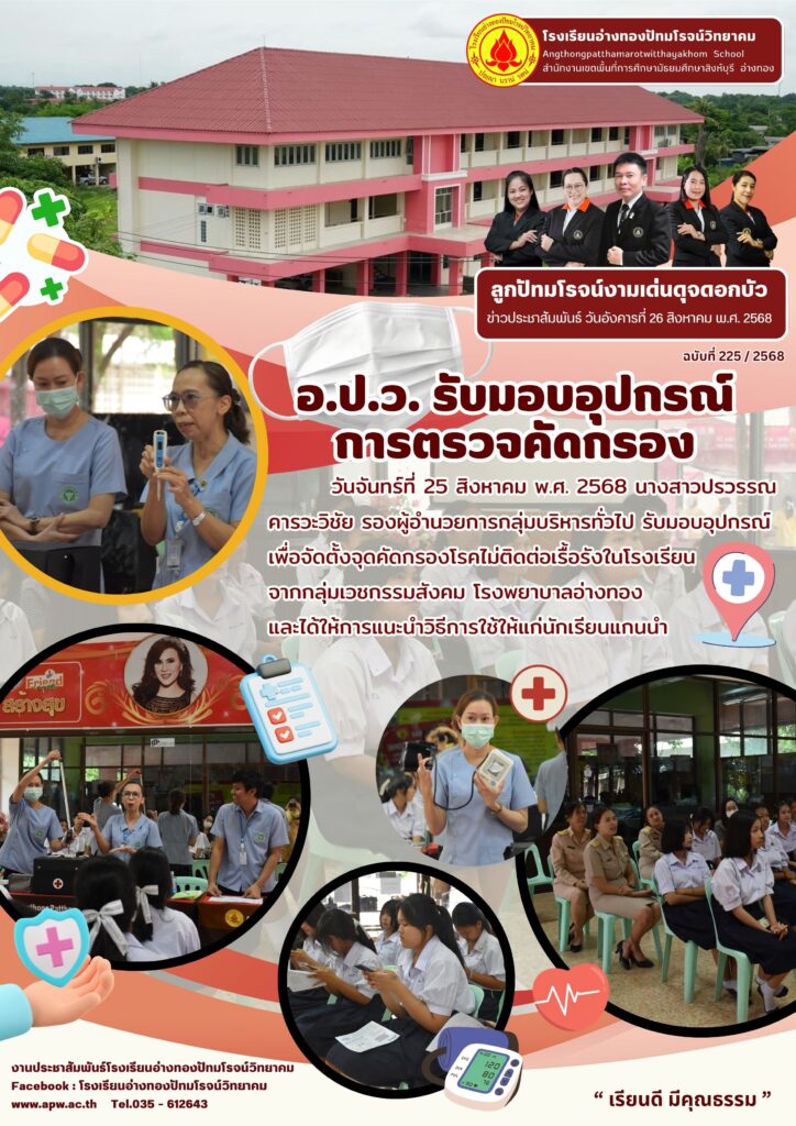วันจันทร์ที่ 25 สิงหาคม พ.ศ. 2568 นางสาวปรวรรณ คารวะวิชัย รองผู้อำนวยการกลุ่มบริหารทั่วไป รับมอบอุปกรณ์เพื่อจัดตั้งจุดคัดกรองโรคไม่ติดต่อเรื้อรังในโรงเรียนจากกลุ่มเวชกรรมสังคม โรงพยาบาลอ่างทอง และได้ให้การแนะนำวิธีการใช้ให้แก่นักเรียนแกนนำ