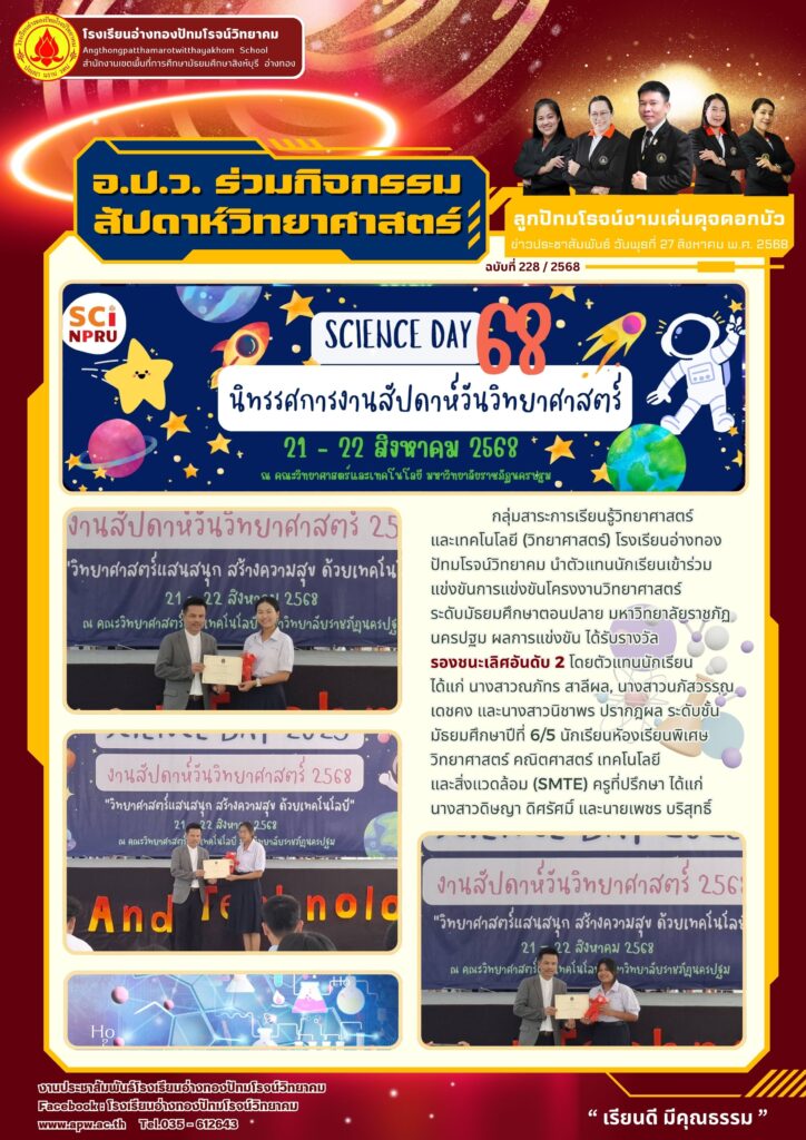 กลุ่มสาระการเรียนรู้วิทยาศาสตร์และเทคโนโลยี (วิทยาศาสตร์) โรงเรียนอ่างทองปัทมโรจน์วิทยาคม นำตัวแทนนักเรียนเข้าร่วมแข่งขันการแข่งขันโครงงานวิทยาศาสตร์ระดับมัธยมศึกษาตอนปลาย มหาวิทยาลัยราชภัฏนครปฐม ผลการแข่งขัน ได้รับรางวัลรองชนะเลิศอันดับ 2 โดยตัวแทนนักเรียน ได้แก่ นางสาวณภัทร สาลีผล, นางสาวนภัสวรรณ เดชคง และนางสาวนิชาพร ปรากฎผล ระดับชั้นมัธยมศึกษาปีที่ 6/5 นักเรียนหัองเรียนพิเศษวิทยาศาสตร์ คณิตศาสตร์ เทคโนโลยีและสิ่งแวดล้อม (SMTE) ครูที่ปรึกษา ได้แก่ นางสาวดิษญา ดิศรัศมิ์ และนายเพชร บริสุทธิ์