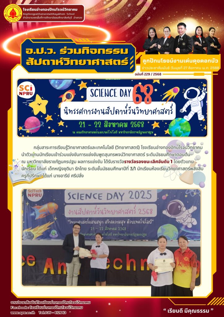 กลุ่มสาระการเรียนรู้วิทยาศาสตร์และเทคโนโลยี (วิทยาศาสตร์) โรงเรียนอ่างทองปัทมโรจน์วิทยาคม นำตัวแทนนักเรียนเข้าร่วมแข่งขันการแข่งขันพูดสุนทรพจน์วิทยาศาสตร์ ระดับมัธยมศึกษาตอนต้น ณ มหาวิทยาลัยราชภัฏนครปฐม ผลการแข่งขัน ได้รับรางวัลรางวัลรองชนะเลิศอันดับ 1 โดยตัวแทนนักเรียน ได้แก่ เด็กหญิงชุติมา รักไทย ระดับชั้นมัธยมศึกษาปีที่ 3/1 นักเรียนห้องเรียนวิทยาศาสตร์พลังสิบ ครูที่ปรึกษา ได้แก่ นางอารีย์ ศรีปลั่ง