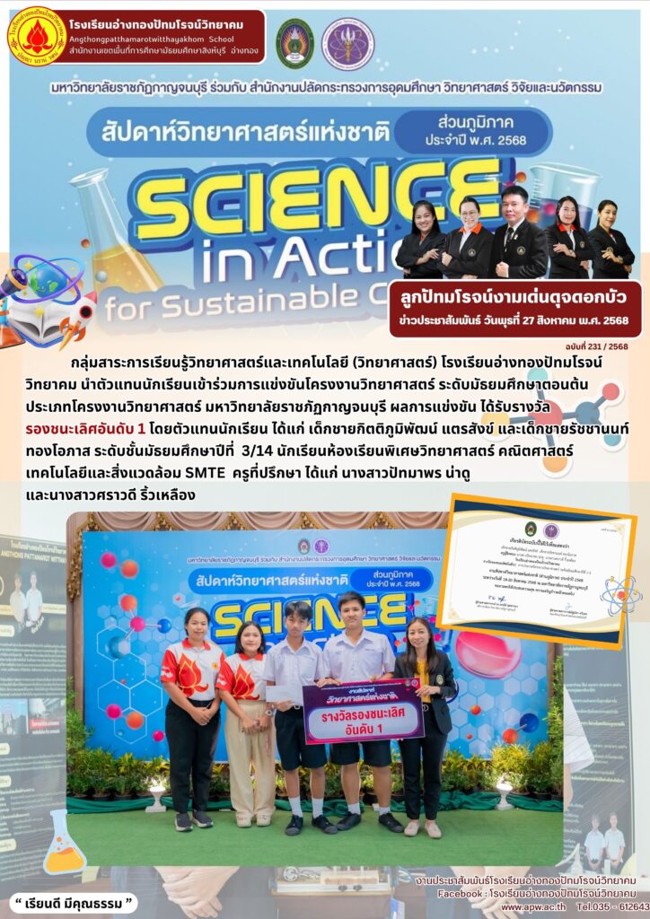 กลุ่มสาระการเรียนรู้วิทยาศาสตร์และเทคโนโลยี (วิทยาศาสตร์) โรงเรียนอ่างทองปัทมโรจน์วิทยาคม นำตัวแทนนักเรียนเข้าร่วมการแข่งขันโครงงานวิทยาศาสตร์ ระดับมัธยมศึกษาตอนต้น ประเภทโครงงานวิทยาศาสตร์ มหาวิทยาลัยราชภัฏกาญจนบุรี ผลการแข่งขัน ได้รับรางวัล รองชนะเลิศอันดับ 1 โดยตัวแทนนักเรียน ได้แก่ เด็กชายกิตติภูมิพัฒน์ แตรสังข์ และเด็กชายรัชชานนท์ ทองโอภาส ระดับชั้นมัธยมศึกษาปีที่ 3/14 นักเรียนห้องเรียนพิเศษวิทยาศาสตร์ คณิตศาสตร์ เทคโนโลยีและสิ่งแวดล้อม SMTE ครูที่ปรึกษา ได้แก่ นางสาวปัทมาพร น่าดู และนางสาวศราวดี ริ้วเหลือง