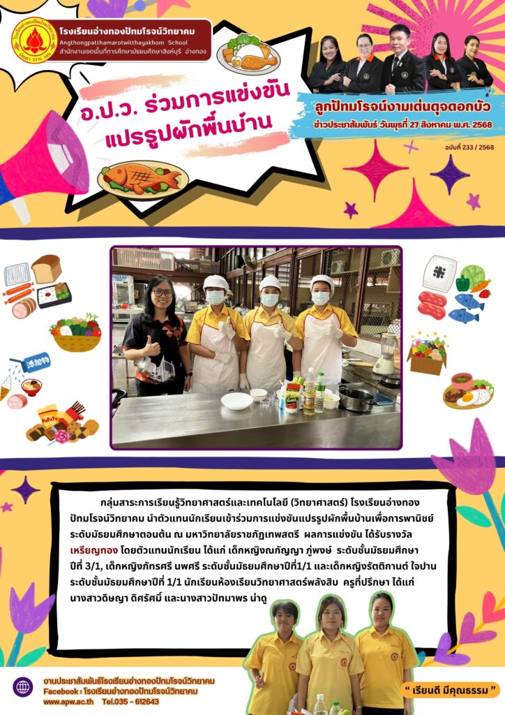 กลุ่มสาระการเรียนรู้วิทยาศาสตร์และเทคโนโลยี (วิทยาศาสตร์) โรงเรียนอ่างทองปัทมโรจน์วิทยาคม นำตัวแทนนักเรียนเข้าร่วมการแข่งขันแปรรูปผักพื้นบ้านเพื่อการพานิชย์ ระดับมัธยมศึกษาตอนต้น ณ มหาวิทยาลัยราชภัฏเทพสตรี ผลการแข่งขัน ได้รับรางวัล เหรียญทอง โดยตัวแทนนักเรียน ได้แก่ เด็กหญิงณกัญญา ภู่พงษ์ ระดับชั้นมัธยมศึกษาปีที่ 3/1, เด็กหญิงภัทรศรี นพศรี ระดับชั้นมัธยมศึกษาปีที่1/1 และเด็กหญิงรัตติกานต์ ใจปาน ระดับชั้นมัธยมศึกษาปีที่ 1/1 นักเรียนห้องเรียนวิทยาศาสตร์พลังสิบ ครูที่ปรึกษา ได้แก่ นางสาวดิษญา ดิศรัศมิ์ และนางสาวปัทมาพร น่าดู