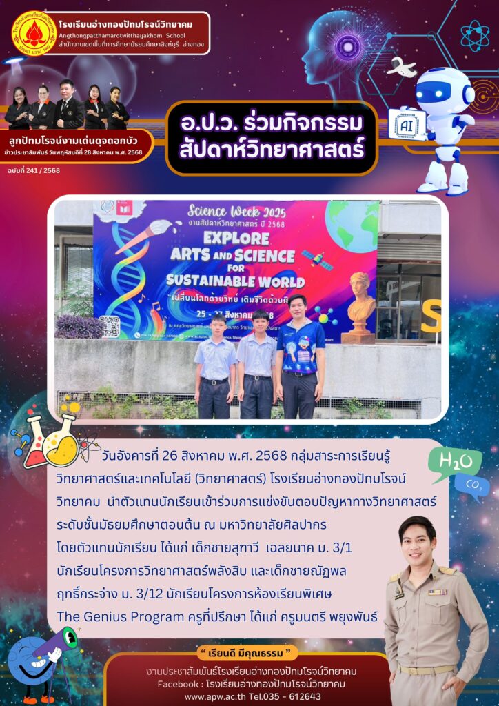วันอังคารที่ 26 สิงหาคม พ.ศ. 2568 กลุ่มสาระการเรียนรู้วิทยาศาสตร์และเทคโนโลยี (วิทยาศาสตร์) โรงเรียนอ่างทองปัทมโรจน์วิทยาคม นำตัวแทนนักเรียนเข้าร่วมการแข่งขันตอบปัญหาทางวิทยาศาสตร์ ระดับชั้นมัธยมศึกษาตอนต้น ณ มหาวิทยาลัยศิลปากร โดยตัวแทนนักเรียน ได้แก่ เด็กชายสุฑาวี เฉลยนาค ม. 3/1 นักเรียนโครงการวิทยาศาสตร์พลังสิบ และเด็กชายณัฏพล ฤทธิ์กระจ่าง ม. 3/12 นักเรียนโครงการห้องเรียนพิเศษ The Genius Program ครูที่ปรึกษา ได้แก่ ครูมนตรี พยุงพันธ์
