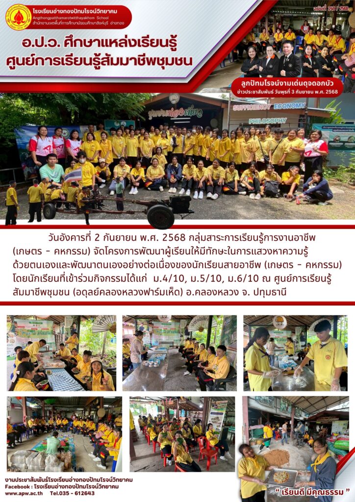 วันอังคารที่ 2 กันยายน พ.ศ. 2568 กลุ่มสาระการเรียนรู้การงานอาชีพ (เกษตร – คหกรรม) จัดโครงการพัฒนาผู้เรียนให้มีทักษะในการแสวงหาความรู้ด้วยตนเองและพัฒนาตนเองอย่างต่อเนื่องของนักเรียนสายอาชีพ (เกษตร – คหกรรม) โดยนักเรียนที่เข้าร่วมกิจกรรมได้แก่ ม.4/10, ม.5/10, ม.6/10 ณ ศูนย์การเรียนรู้สัมมาชีพชุมชน (อดุลย์คลองหลวงฟาร์มเห็ด) อ.คลองหลวง จ. ปทุมธานี