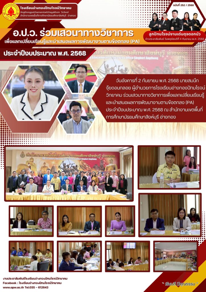วันอังคารที่ 2 กันยายน พ.ศ. 2568 นายสมนึก จุ้ยดอนกลอย ผู้อำนวยการโรงเรียนอ่างทองปัทมโรจน์วิทยาคม ร่วมเสวนาทางวิชาการเพื่อแลกเปลี่ยนเรียนรู้และนำเสนอผลการพัฒนางานตามข้อตกลง (PA) ประจำปีงบประมาณ พ.ศ. 2568 ณ สำนักงานเขตพื้นที่การศึกษามัธยมศึกษาสิงห์บุรี อ่างทอง