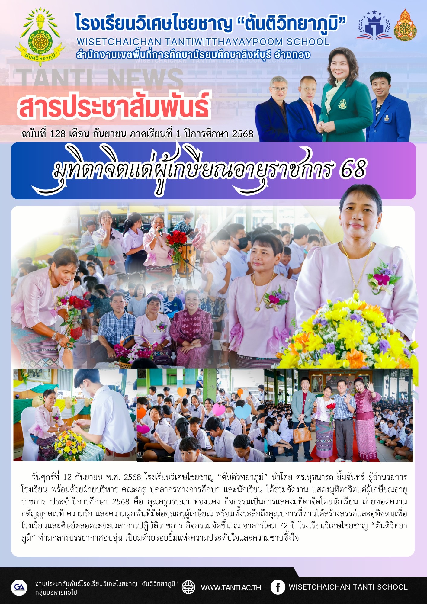 วันศุกร์ที่ 12 กันยายน พ.ศ. 2568 โรงเรียนวิเศษไชยชาญ “ตันติวิทยาภูมิ” นำโดย ดร.นุชนารถ ยิ้มจันทร์ ผู้อำนวยการโรงเรียน พร้อมด้วยฝ่ายบริหาร คณะครู บุคลากรทางการศึกษา และนักเรียน ได้ร่วมจัดงาน แสดงมุทิตาจิตแด่ผู้เกษียณอายุราชการ ประจำปีการศึกษา 2568 คือ คุณครูวรรณา ทองแดง กิจกรรมเป็นการแสดงมุทิตาจิตโดยนักเรียน ถ่ายทอดความกตัญญูกตเวที ความรัก และความผูกพันที่มีต่อคุณครูผู้เกษียณ พร้อมทั้งระลึกถึงคุณูปการที่ท่านได้สร้างสรรค์และอุทิศตนเพื่อโรงเรียนและศิษย์ตลอดระยะเวลาการปฏิบัติราชการ กิจกรรมจัดขึ้น ณ อาคารโดม 72 ปี โรงเรียนวิเศษไชยชาญ “ตันติวิทยาภูมิ” ท่ามกลางบรรยากาศอบอุ่น เปี่ยมด้วยรอยยิ้มแห่งความประทับใจและความซาบซึ้งใจ