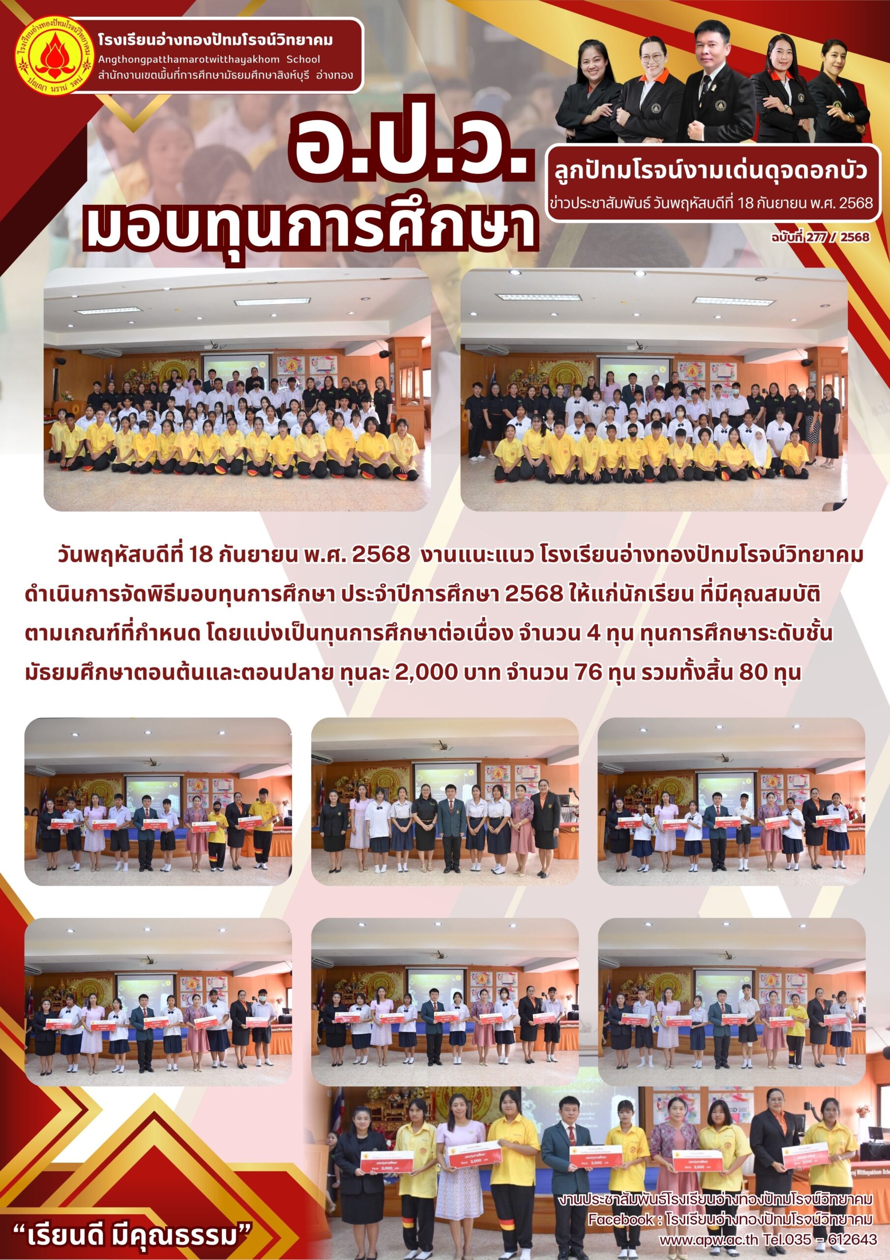 วันพฤหัสบดีที่ 18 กันยายน พ.ศ. 2568 งานแนะแนว โรงเรียนอ่างทองปัทมโรจน์วิทยาคม ดำเนินการจัดพิธีมอบทุนการศึกษา ประจำปีการศึกษา 2568 ให้แก่นักเรียน ที่มีคุณสมบัติตามเกณฑ์ที่กำหนด โดยแบ่งเป็นทุนการศึกษาต่อเนื่อง จำนวน 4 ทุน ทุนการศึกษาระดับชั้นมัธยมศึกษาตอนต้นและตอนปลาย ทุนละ 2,000 บาท จำนวน 76 ทุน รวมทั้งสิ้น 80 ทุน