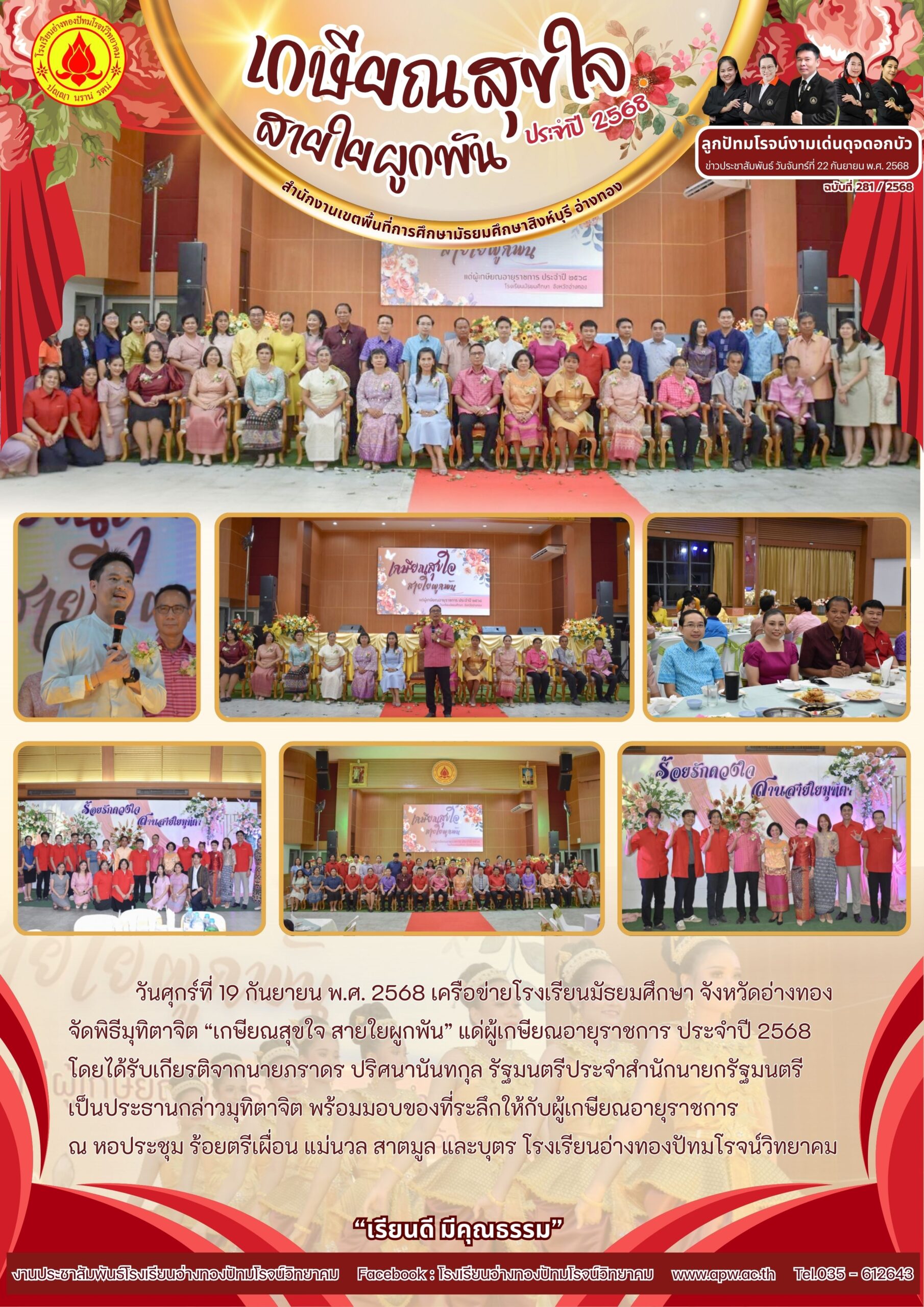 วันศุกร์ที่ 19 กันยายน พ.ศ. 2568 เครือข่ายโรงเรียนมัธยมศึกษา จังหวัดอ่างทอง จัดพิธีมุทิตาจิต “เกษียณสุขใจ สายใยผูกพัน” แด่ผู้เกษียณอายุราชการ ประจำปี 2568 โดยได้รับเกียรติจากนายภราดร ปริศนานันทกุล รัฐมนตรีประจำสำนักนายกรัฐมนตรี เป็นประธานกล่าวมุทิตาจิต พร้อมมอบของที่ระลึกให้กับผู้เกษียณอายุราชการ ณ หอประชุม ร้อยตรีเผื่อน แม่นวล สาตมูล และบุตร โรงเรียนอ่างทองปัทมโรจน์วิทยาคม