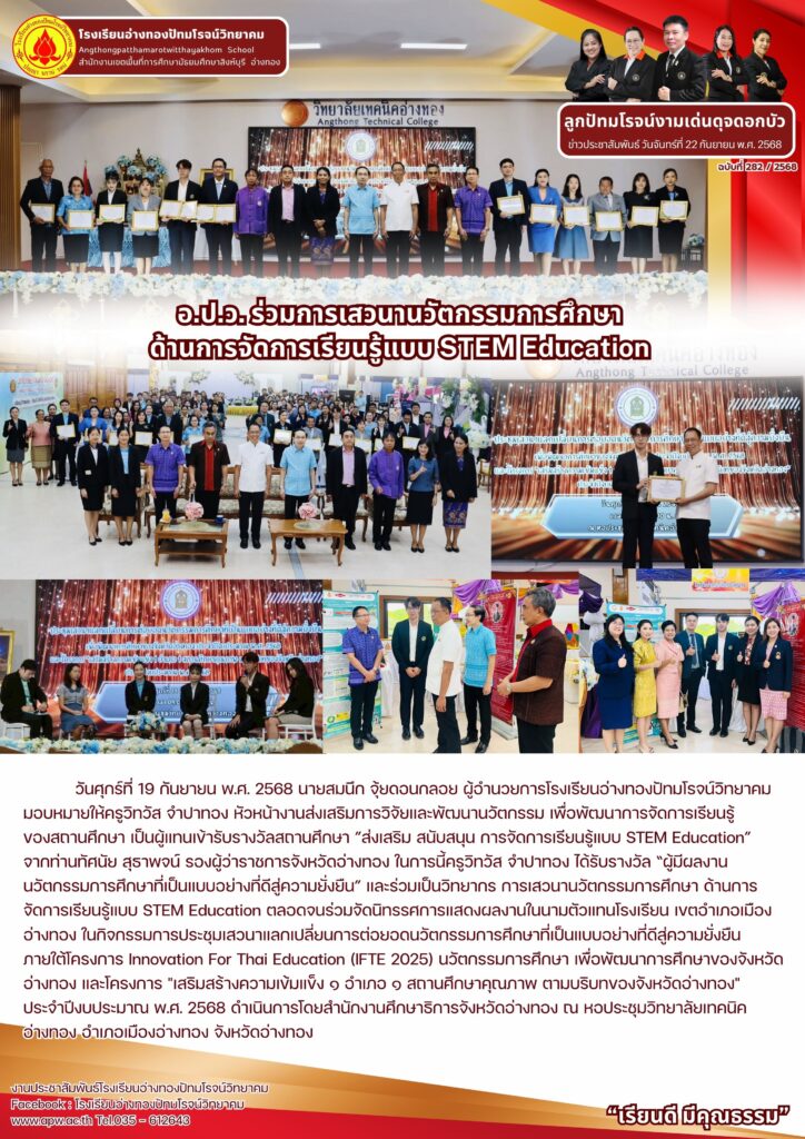 วันศุกร์ที่ 19 กันยายน พ.ศ. 2568 นายสมนึก จุ้ยดอนกลอย ผู้อำนวยการโรงเรียนอ่างทองปัทมโรจน์วิทยาคม มอบหมายให้ครูวิทวัส จำปาทอง หัวหน้างานส่งเสริมการวิจัยและพัฒนานวัตกรรม เพื่อพัฒนาการจัดการเรียนรู้ของสถานศึกษา เป็นผู้แทนเข้ารับรางวัลสถานศึกษา ”ส่งเสริม สนับสนุน การจัดการเรียนรู้แบบ STEM Education” จากท่านทัศนัย สุธาพจน์ รองผู้ว่าราชการจังหวัดอ่างทอง ในการนี้ครูวิทวัส จำปาทอง ได้รับรางวัล “ผู้มีผลงานนวัตกรรมการศึกษาที่เป็นแบบอย่างที่ดีสู่ความยั่งยืน” และร่วมเป็นวิทยากร การเสวนานวัตกรรมการศึกษา ด้านการจัดการเรียนรู้แบบ STEM Education ตลอดจนร่วมจัดนิทรรศการแสดงผลงานในนามตัวแทนโรงเรียน เขตอำเภอเมืองอ่างทอง ในกิจกรรมการประชุมเสวนาแลกเปลี่ยนการต่อยอดนวัตกรรมการศึกษาที่เป็นแบบอย่างที่ดีสู่ความยั่งยืนภายใต้โครงการ Innovation For Thai Education (IFTE 2025) นวัตกรรมการศึกษา เพื่อพัฒนาการศึกษาของจังหวัดอ่างทอง และโครงการ “เสริมสร้างความเข้มแข็ง ๑ อำเภอ ๑ สถานศึกษาคุณภาพ ตามบริบทของจังหวัดอ่างทอง” ประจำปีงบประมาณ พ.ศ. 2568 ดำเนินการโดยสำนักงานศึกษาธิการจังหวัดอ่างทอง ณ หอประชุมวิทยาลัยเทคนิคอ่างทอง อำเภอเมืองอ่างทอง จังหวัดอ่างทอง
