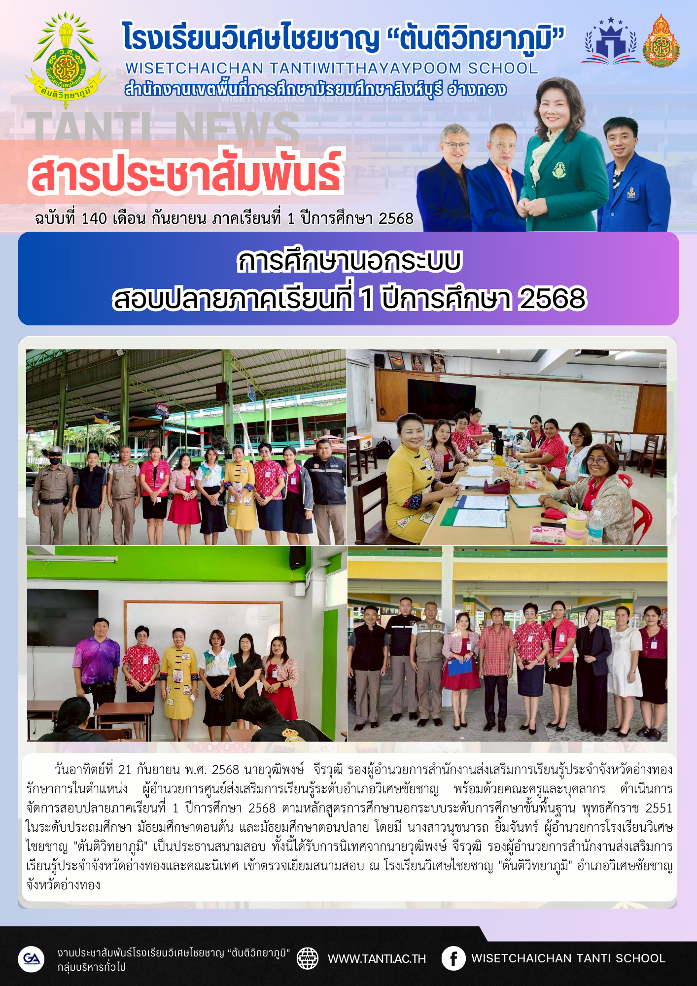 วันอาทิตย์ที่ 21 กันยายน พ.ศ. 2568 นายวุฒิพงษ์ จีรวุฒิ รองผู้อำนวยการสำนักงานส่งเสริมการเรียนรู้ประจำจังหวัดอ่างทอง รักษาการในตำแหน่ง ผู้อำนวยการศูนย์ส่งเสริมการเรียนรู้ระดับอำเภอวิเศษชัยชาญ พร้อมด้วยคณะครูและบุคลากร ดำเนินการจัดการสอบปลายภาคเรียนที่ 1 ปีการศึกษา 2568 ตามหลักสูตรการศึกษานอกระบบระดับการศึกษาขั้นพื้นฐาน พุทธศักราช 2551 ในระดับประถมศึกษา มัธยมศึกษาตอนต้น และมัธยมศึกษาตอนปลาย โดยมี นางสาวนุชนารถ ยิ้มจันทร์ ผู้อำนวยการโรงเรียนวิเศษไชยชาญ “ตันติวิทยาภูมิ” เป็นประธานสนามสอบ ทั้งนี้ได้รับการนิเทศจากนายวุฒิพงษ์ จีรวุฒิ รองผู้อำนวยการสำนักงานส่งเสริมการเรียนรู้ประจำจังหวัดอ่างทองและคณะนิเทศ เข้าตรวจเยี่ยมสนามสอบ ณ โรงเรียนวิเศษไชยชาญ “ตันติวิทยาภูมิ” อำเภอวิเศษชัยชาญ จังหวัดอ่างทอง