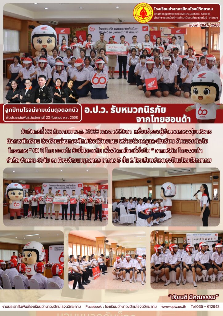 วันจันทร์ที่ 22 กันยายน พ.ศ. 2568 นางสาววิรัชดา หรั่งแร่ รองผู้อำนวยการกลุ่มบริหารกิจการนักเรียน โรงเรียนอ่างทองปัทมโรจน์วิทยาคม พร้อมด้วยครูและนักเรียน รับหมวกนิรภัยโครงการ “ 60 ปี ไทย ฮอนด้า ขับขี่ปลอดภัย เพื่อสังคมไทยที่ยั่งยืน ” จากบริษัท ไทยฮอนด้า จำกัด จำนวน 40 ใบ ณ ห้องพัฒนาบุคลากร อาคาร 5 ชั้น 2 โรงเรียนอ่างทองปัทมโรจน์วิทยาคม