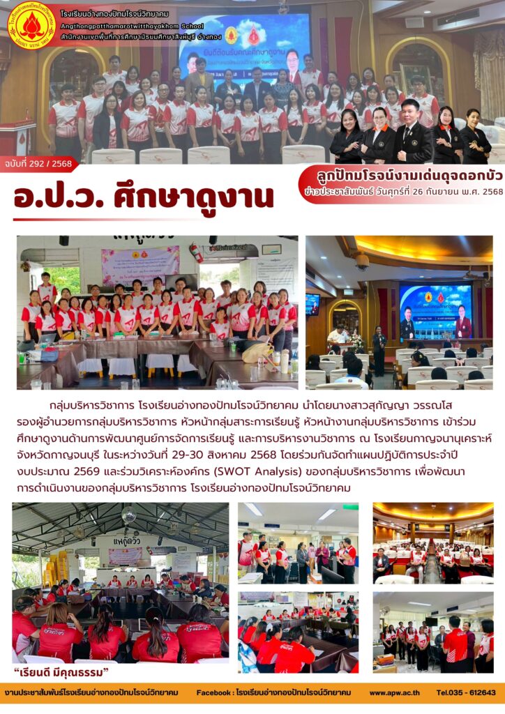 กลุ่มบริหารวิชาการ โรงเรียนอ่างทองปัทมโรจน์วิทยาคม นำโดยนางสาวสุกัญญา วรรณโส รองผู้อำนวยการกลุ่มบริหารวิชาการ หัวหน้ากลุ่มสาระการเรียนรู้ หัวหน้างานกลุ่มบริหารวิชาการ เข้าร่วมศึกษาดูงานด้านการพัฒนาศูนย์การจัดการเรียนรู้ และการบริหารงานวิชาการ ณ โรงเรียนกาญจนานุเคราะห์ จังหวัดกาญจนบุรี ในระหว่างวันที่ 29-30 สิงหาคม 2568 โดยร่วมกันจัดทำแผนปฏิบัติการประจำปีงบประมาณ 2569 และร่วมวิเคราะห์องค์กร (SWOT Analysis) ของกลุ่มบริหารวิชาการ เพื่อพัฒนาการดำเนินงานของกลุ่มบริหารวิชาการ โรงเรียนอ่างทองปัทมโรจน์วิทยาคม