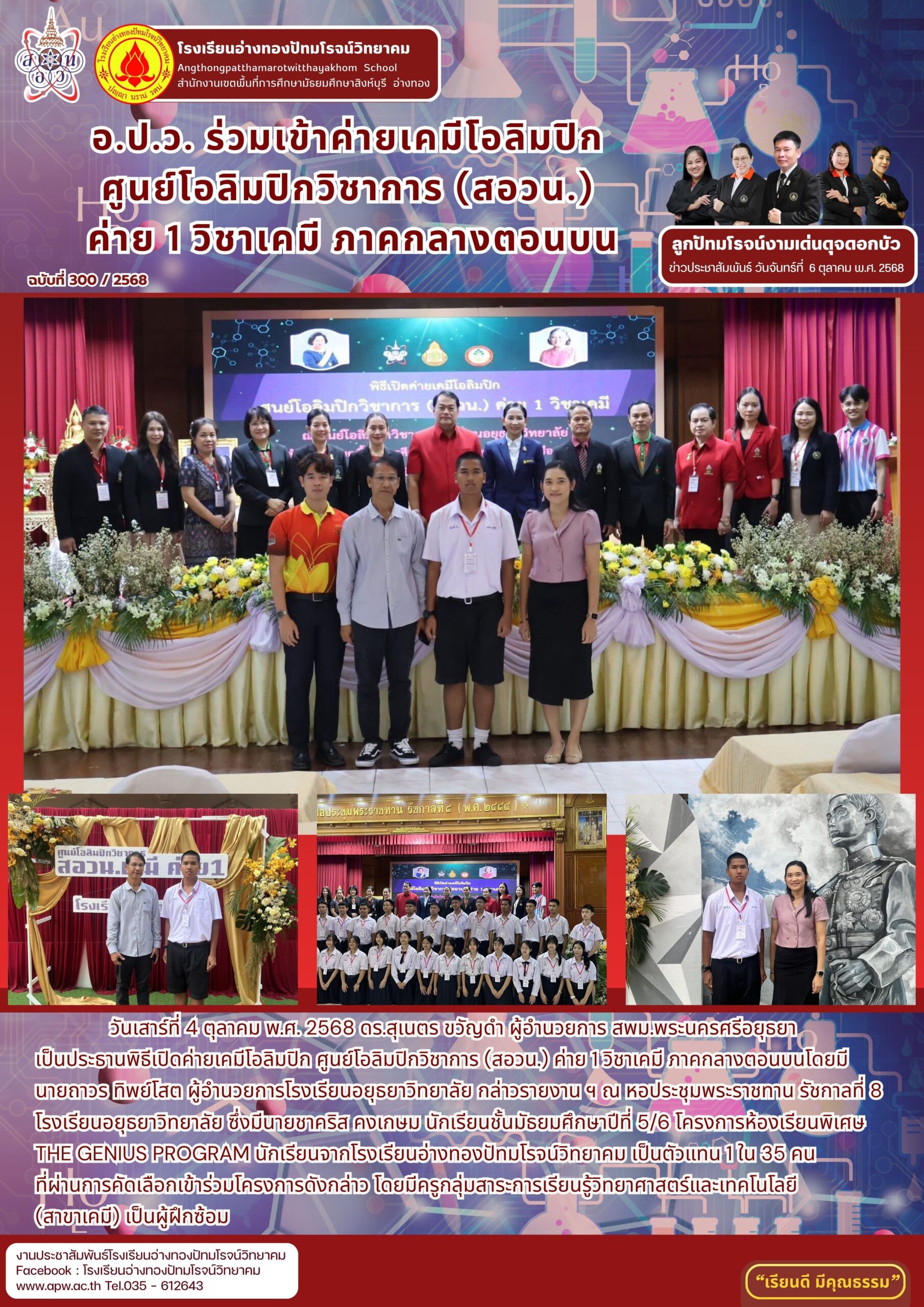 วันเสาร์ที่ 4 ตุลาคม พ.ศ. 2568 ดร.สุเนตร ขวัญดำ ผู้อำนวยการ สพม.พระนครศรีอยุธยา เป็นประธานพิธีเปิดค่ายเคมีโอลิมปิก ศูนย์โอลิมปิกวิชาการ (สอวน.) ค่าย 1 วิชาเคมี ภาคกลางตอนบนโดยมีนายถาวร ทิพย์โสต ผู้อำนวยการโรงเรียนอยุธยาวิทยาลัย กล่าวรายงาน ฯ ณ หอประชุมพระราชทาน รัชกาลที่ 8 โรงเรียนอยุธยาวิทยาลัย ซึ่งมีนายชาคริส คงเกษม นักเรียนชั้นมัธยมศึกษาปีที่ 5/6 โครงการห้องเรียนพิเศษ The Genius Program นักเรียนจากโรงเรียนอ่างทองปัทมโรจน์วิทยาคม เป็นตัวแทน 1 ใน 35 คน ที่ผ่านการคัดเลือกเข้าร่วมโครงการดังกล่าว โดยมีครูกลุ่มสาระการเรียนรู้วิทยาศาสตร์และเทคโนโลยี (สาขาเคมี) เป็นผู้ฝึกซ้อม