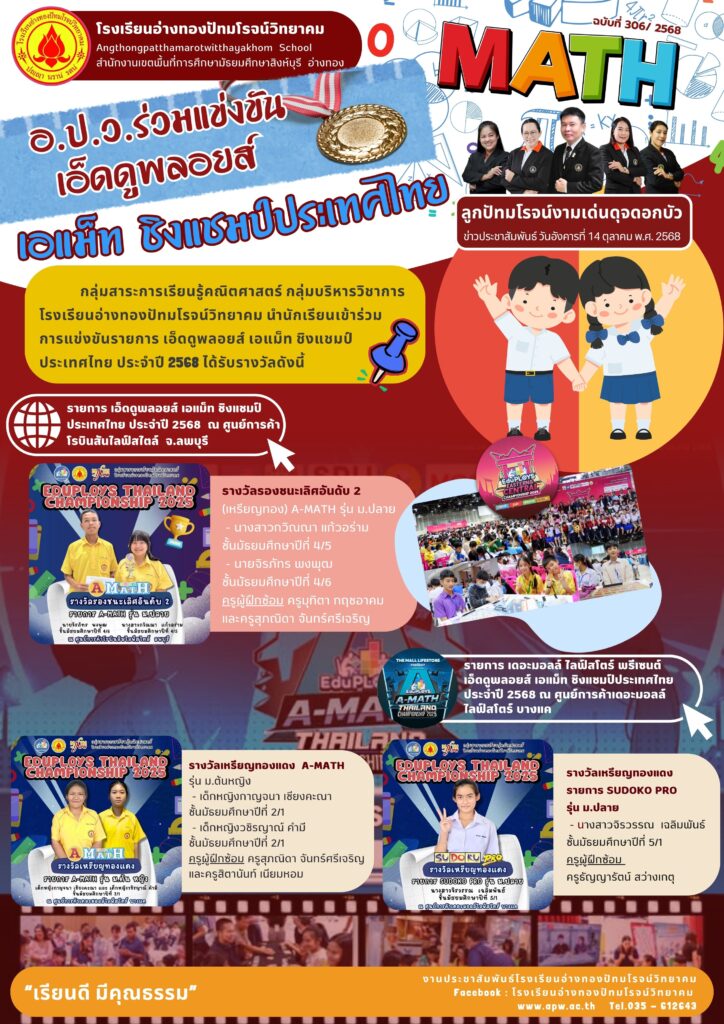 กลุ่มสาระการเรียนรู้คณิตศาสตร์ กลุ่มบริหารวิชาการ โรงเรียนอ่างทองปัทมโรจน์วิทยาคม นำนักเรียนเข้าร่วมการแข่งขันรายการ เอ็ดดูพลอยส์ เอแม็ท ชิงแชมป์ประเทศไทย ประจำปี 2568 ได้รับรางวัลดังนี้