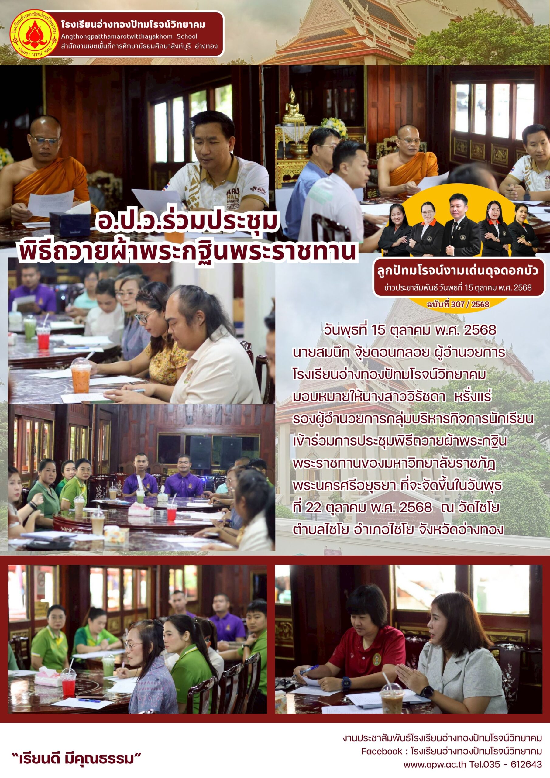 วันพุธที่ 15 ตุลาคม พ.ศ. 2568 นายสมนึก จุ้ยดอนกลอย ผู้อำนวยการโรงเรียนอ่างทองปัทมโรจน์วิทยาคม มอบหมายให้นางสาววิรัชดา หรั่งแร่ รองผู้อำนวยการกลุ่มบริหารกิจการนักเรียน เข้าร่วมการประชุมพิธีถวายผ้าพระกฐินพระราชทานของมหาวิทยาลัยราชภัฏพระนครศรีอยุธยา ที่จะจัดขึ้นในวันพุธที่ 22 ตุลาคม พ.ศ. 2568 ณ วัดไชโย ตำบลไชโย อำเภอไชโย จังหวัดอ่างทอง