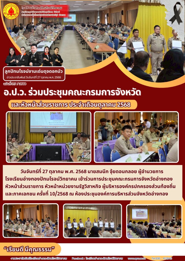 วันจันทร์ที่ 27 ตุลาคม พ.ศ. 2568 นายสมนึก จุ้ยดอนกลอย ผู้อำนวยการโรงเรียนอ่างทองปัทมโรจน์วิทยาคม เข้าร่วมการประชุมคณะกรมการจังหวัดอ่างทอง หัวหน้าส่วนราชการ หัวหน้าหน่วยงานรัฐวิสาหกิจ ผู้บริหารองค์กรปกครองส่วนท้องถิ่น และภาคเอกชน ครั้งที่ 10/2568 ณ ห้องประชุมองค์การบริหารส่วนจังหวัดอ่างทอง