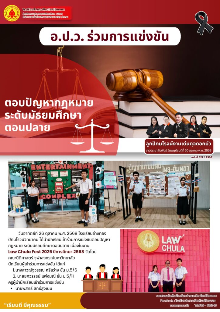 วันอาทิตย์ที่ 26 ตุลาคม พ.ศ. 2568 โรงเรียนอ่างทองปัทมโรจน์วิทยาคม ได้นำนักเรียนเข้าร่วมการแข่งขันตอบปัญหากฎหมาย ระดับมัธยมศึกษาตอนปลาย เนื่องในงาน Law Chula Fest 2025 ปีการศึกษา 2568 จัดโดยคณะนิติศาสตร์ จุฬาลงกรณ์มหาวิทยาลัย นักเรียนผู้เข้าร่วมการแข่งขัน ได้แก่
