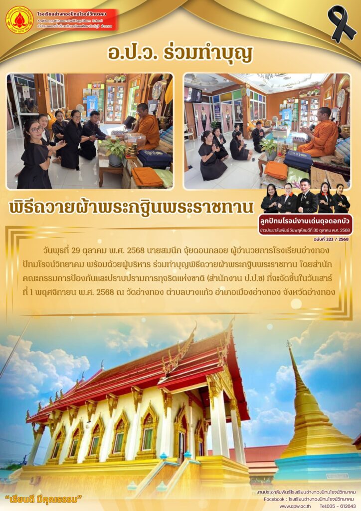 วันพุธที่ 29 ตุลาคม พ.ศ. 2568 นายสมนึก จุ้ยดอนกลอย ผู้อำนวยการโรงเรียนอ่างทองปัทมโรจน์วิทยาคม พร้อมด้วยผู้บริหาร ร่วมทำบุญพิธีถวายผ้าพระกฐินพระราชทาน โดยสำนักคณะกรรมการป้องกันและปราบปรามการทุจริตแห่งชาติ (สำนักงาน ป.ป.ช) ที่จะจัดขึ้นในวันเสาร์ที่ 1 พฤศจิกายน พ.ศ. 2568 ณ วัดอ่างทอง ตำบลบางแก้ว อำเภอเมืองอ่างทอง จังหวัดอ่างทอง