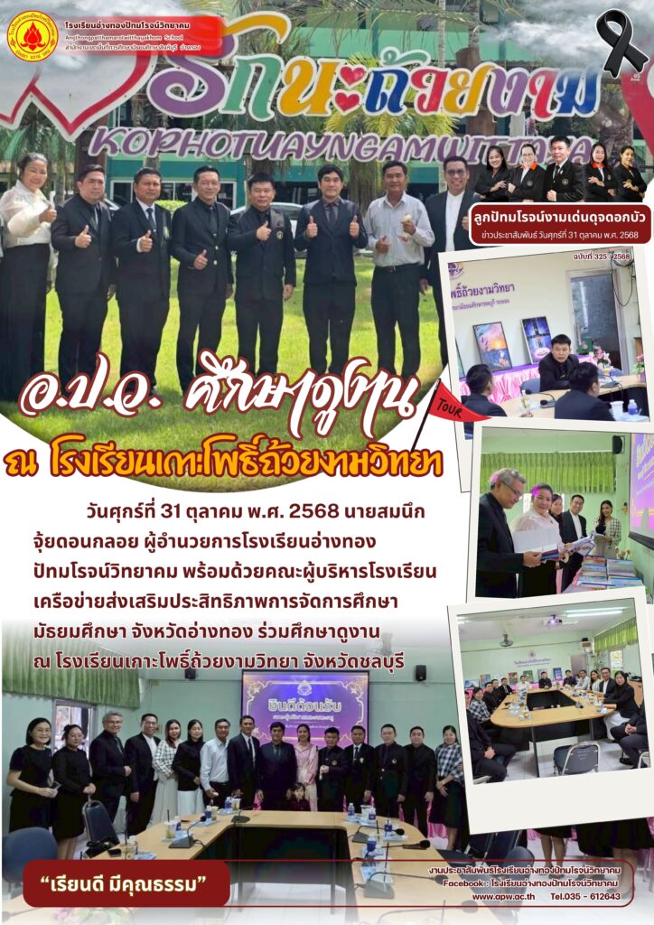 วันศุกร์ที่ 31 ตุลาคม พ.ศ. 2568 นายสมนึก จุ้ยดอนกลอย ผู้อำนวยการโรงเรียนอ่างทองปัทมโรจน์วิทยาคม พร้อมด้วยคณะผู้บริหารโรงเรียนเครือข่ายส่งเสริมประสิทธิภาพการจัดการศึกษามัธยมศึกษา จังหวัดอ่างทอง ร่วมศึกษาดูงาน ณ โรงเรียนเกาะโพธิ์ถ้วยงามวิทยา จังหวัดชลบุรี