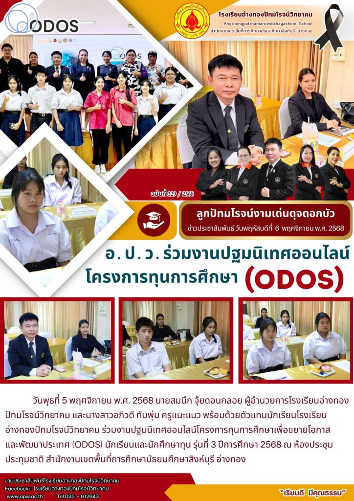 วันพุธที่ 5 พฤศจิกายน พ.ศ. 2568 นายสมนึก จุ้ยดอนกลอย ผู้อำนวยการโรงเรียนอ่างทองปัทมโรจน์วิทยาคม และนางสาวอภิวดี ทับพุ่ม ครูแนะแนว พร้อมด้วยตัวแทนนักเรียนโรงเรียนอ่างทองปัทมโรจน์วิทยาคม ร่วมงานปฐมนิเทศออนไลน์โครงการทุนการศึกษาเพื่อขยายโอกาสและพัฒนาประเทศ (ODOS) นักเรียนและนักศึกษาทุน รุ่นที่ 3 ปีการศึกษา 2568 ณ ห้องประชุมประทุมชาติ สำนักงานเขตพื้นที่การศึกษามัธยมศึกษาสิงห์บุรี อ่างทอง