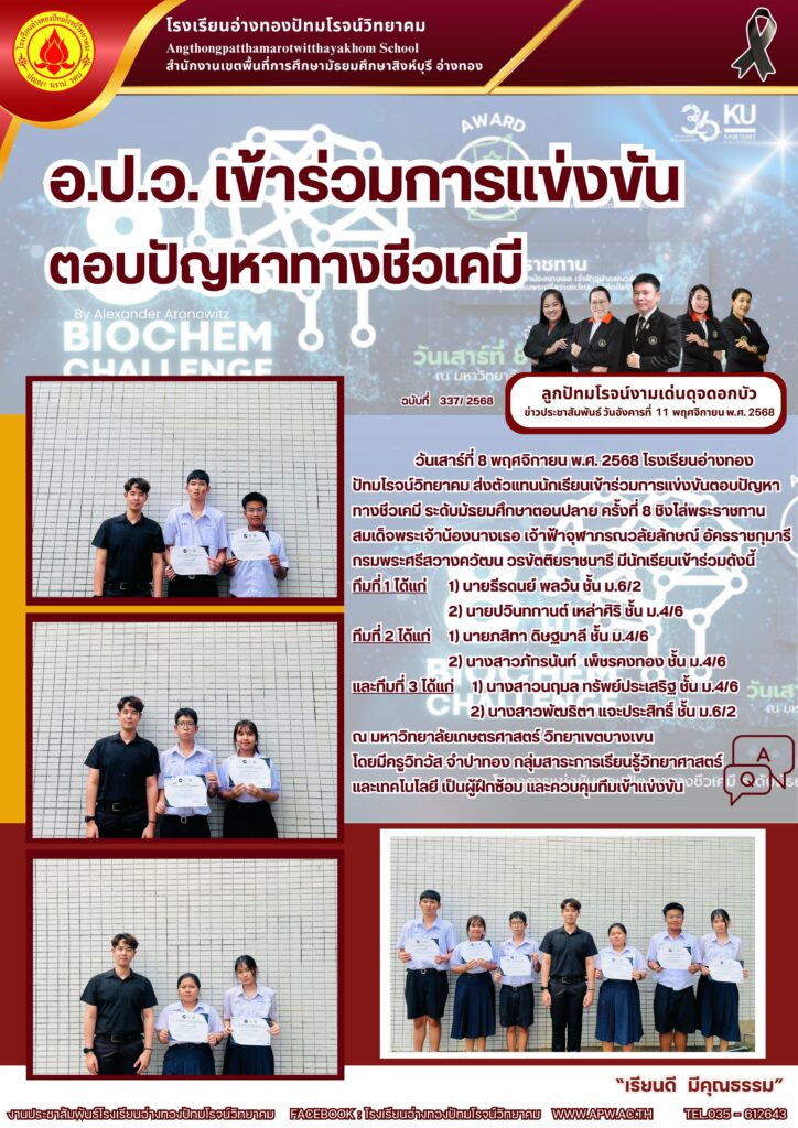วันเสาร์ที่ 8 พฤศจิกายน พ.ศ. 2568 โรงเรียนอ่างทองปัทมโรจน์วิทยาคม ส่งตัวแทนนักเรียนเข้าร่วมการแข่งขันตอบปัญหาทางชีวเคมี ระดับมัธยมศึกษาตอนปลาย ครั้งที่ 8 ชิงโล่พระราชทานสมเด็จพระเจ้าน้องนางเธอ เจ้าฟ้าจุฬาภรณวลัยลักษณ์ อัครราชกุมารี กรมพระศรีสวางควัฒน วรขัตติยราชนารี มีนักเรียนเข้าร่วมดังนี้