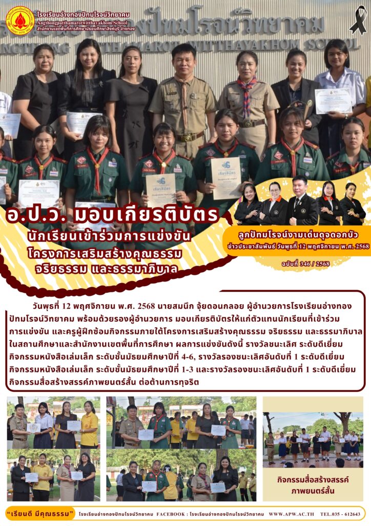 วันพุธที่ 12 พฤศจิกายน พ.ศ. 2568 นายสมนึก จุ้ยดอนกลอย ผู้อำนวยการโรงเรียนอ่างทองปัทมโรจน์วิทยาคม พร้อมด้วยรองผู้อำนวยการ มอบเกียรติบัตรให้แก่ตัวแทนนักเรียนที่เข้าร่วมการแข่งขัน และครูผู้ฝึกซ้อมกิจกรรมภายใต้โครงการเสริมสร้างคุณธรรม จริยธรรม และธรรมาภิบาลในสถานศึกษาและสำนักงานเขตพื้นที่การศึกษา ผลการแข่งขันดังนี้ รางวัลชนะเลิศ ระดับดีเยี่ยม กิจกรรมหนังสือเล่มเล็ก ระดับชั้นมัธยมศึกษาปีที่ 4-6, รางวัลรองชนะเลิศอันดับที่ 1 ระดับดีเยี่ยม กิจกรรมหนังสือเล่มเล็ก ระดับชั้นมัธยมศึกษาปีที่ 1-3 และรางวัลรองชนะเลิศอันดับที่ 1 ระดับดีเยี่ยม กิจกรรมสื่อสร้างสรรค์ภาพยนตร์สั้น ต่อต้านการทุจริต