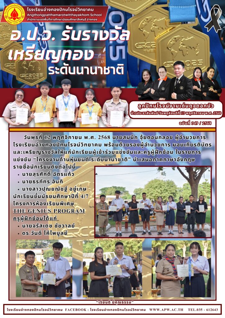 วันพุธที่ 12 พฤศจิกายน พ.ศ. 2568 นายสมนึก จุ้ยดอนกลอย ผู้อํานวยการ โรงเรียนอ่างทองปัทมโรจน์วิทยาคม พร้อมด้วยรองผู้อำนวยการ มอบเกียรติบัตรและเหรียญรางวัลให้แก่นักเรียนผู้เข้าร่วมแข่งขันและครูผู้ฝึกซ้อม ในรายการแข่งขัน “โครงงานด้านหุ่นยนต์ ระดับนานาชาติ” นำเสนอภาคภาษาอังกฤษ