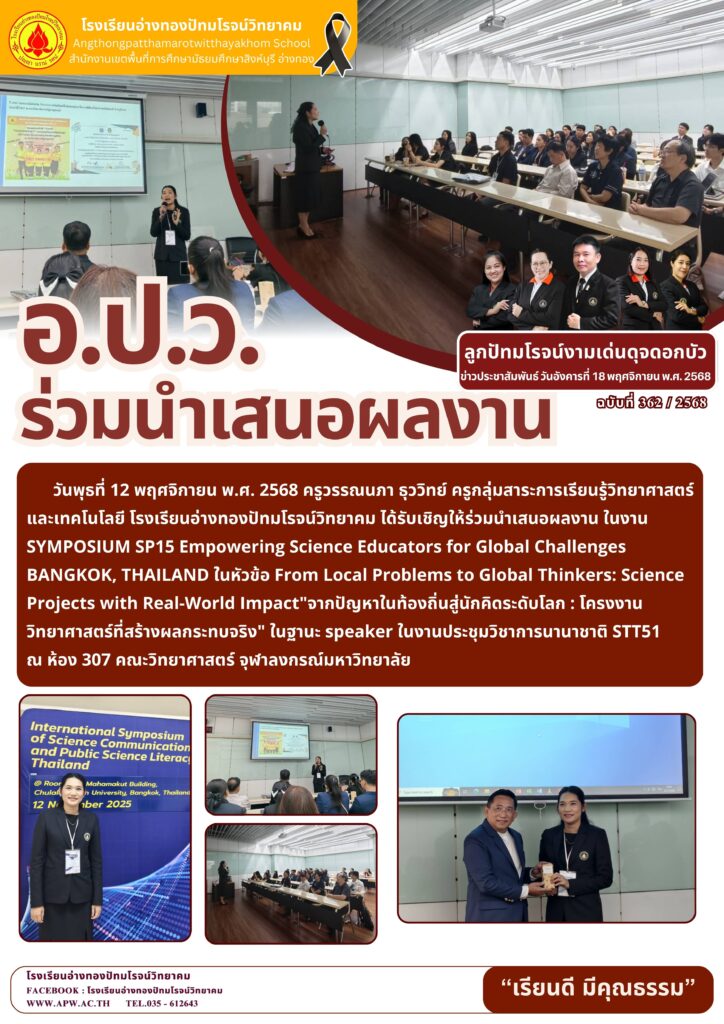 วันพุธที่ 12 พฤศจิกายน พ.ศ. 2568 ครูวรรณนภา ธุววิทย์ ครูกลุ่มสาระการเรียนรู้วิทยาศาสตร์และเทคโนโลยี โรงเรียนอ่างทองปัทมโรจน์วิทยาคม ได้รับเชิญให้ร่วมนำเสนอผลงาน ในงาน SYMPOSIUM SP15 Empowering Science Educators for Global Challenges BANGKOK, THAILAND ในหัวข้อ From Local Problems to Global Thinkers: Science Projects with Real-World Impact”จากปัญหาในท้องถิ่นสู่นักคิดระดับโลก : โครงงานวิทยาศาสตร์ที่สร้างผลกระทบจริง” ในฐานะ speaker ในงานประชุมวิชาการนานาชาติ STT51 ณ ห้อง 307 คณะวิทยาศาสตร์ จุฬาลงกรณ์มหาวิทยาลัย