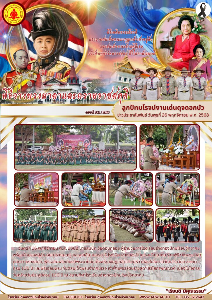 วันพุธที่ 26 พฤศจิกายน พ.ศ. 2568 นายสมนึก จุ้ยดอนกลอย ผู้อำนวยการโรงเรียนอ่างทองปัทมโรจน์วิทยาคม พร้อมด้วยรองผู้อำนวยการ คณะครู และลูกเสือ-เนตรนารี โรงเรียนอ่างทองปัทมโรจน์วิทยาคม ร่วมพิธีวางพวงมาลาและถวายราชสดุดี, พิธีเฉลิมพระเกียรติพระบาทสมเด็จพระมงกุฎเกล้าเจ้าอยู่หัว เนื่องในโอกาสวันคล้ายวันสวรรคตครบ 100 ปี และพิธีเฉลิมพระเกียติสมเด็จพระเจ้าภคินีเธอ เจ้าฟ้าเพชรรัตนราชสุดา สิริโสภาพัณณวดี เนื่องในโอกาสวันคล้ายวันประสูติครบ 100 ปี ณ สนามกีฬาโรงเรียนอ่างทองปัทมโรจน์วิทยาคม