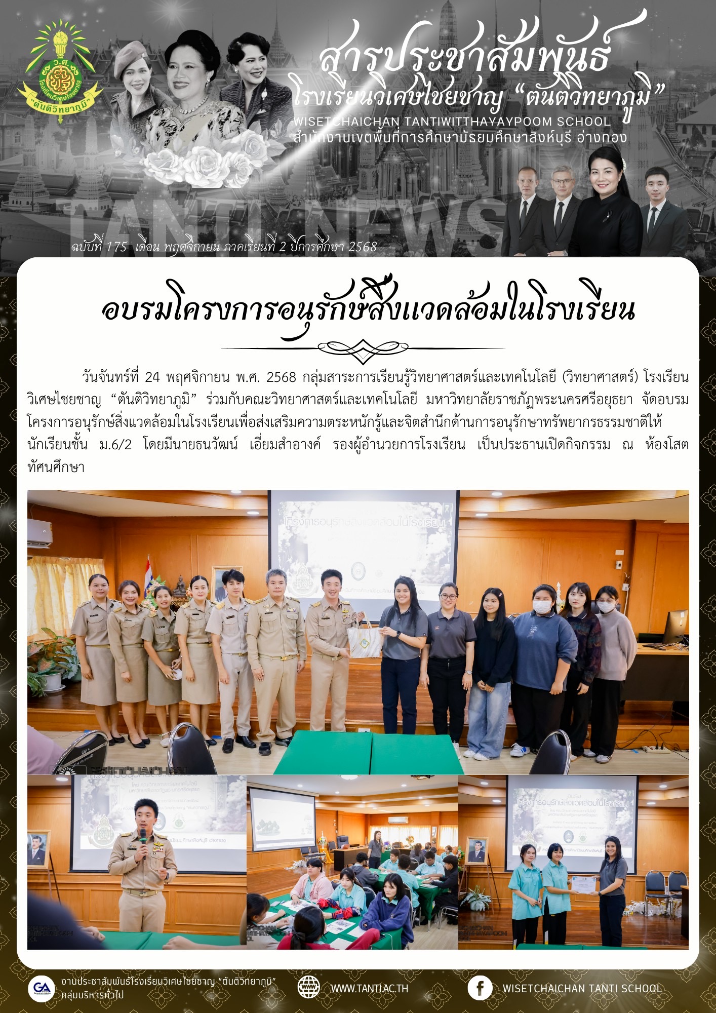 วันจันทร์ที่ 24 พฤศจิกายน พ.ศ. 2568 กลุ่มสาระการเรียนรู้วิทยาศาสตร์และเทคโนโลยี (วิทยาศาสตร์) โรงเรียนวิเศษไชยชาญ “ตันติวิทยาภูมิ” ร่วมกับคณะวิทยาศาสตร์และเทคโนโลยี มหาวิทยาลัยราชภัฏพระนครศรีอยุธยา จัดอบรมโครงการอนุรักษ์สิ่งแวดล้อมในโรงเรียน เพื่อส่งเสริมความตระหนักรู้และจิตสำนึกด้านการอนุรักษ์ทรัพยากรธรรมชาติให้นักเรียนชั้น ม.6/2 โดยมีนายธนวัฒน์ เอี่ยมสำอางค์ รองผู้อำนวยการโรงเรียน เป็นประธานเปิดกิจกรรม ณ ห้องโสตทัศนศึกษา