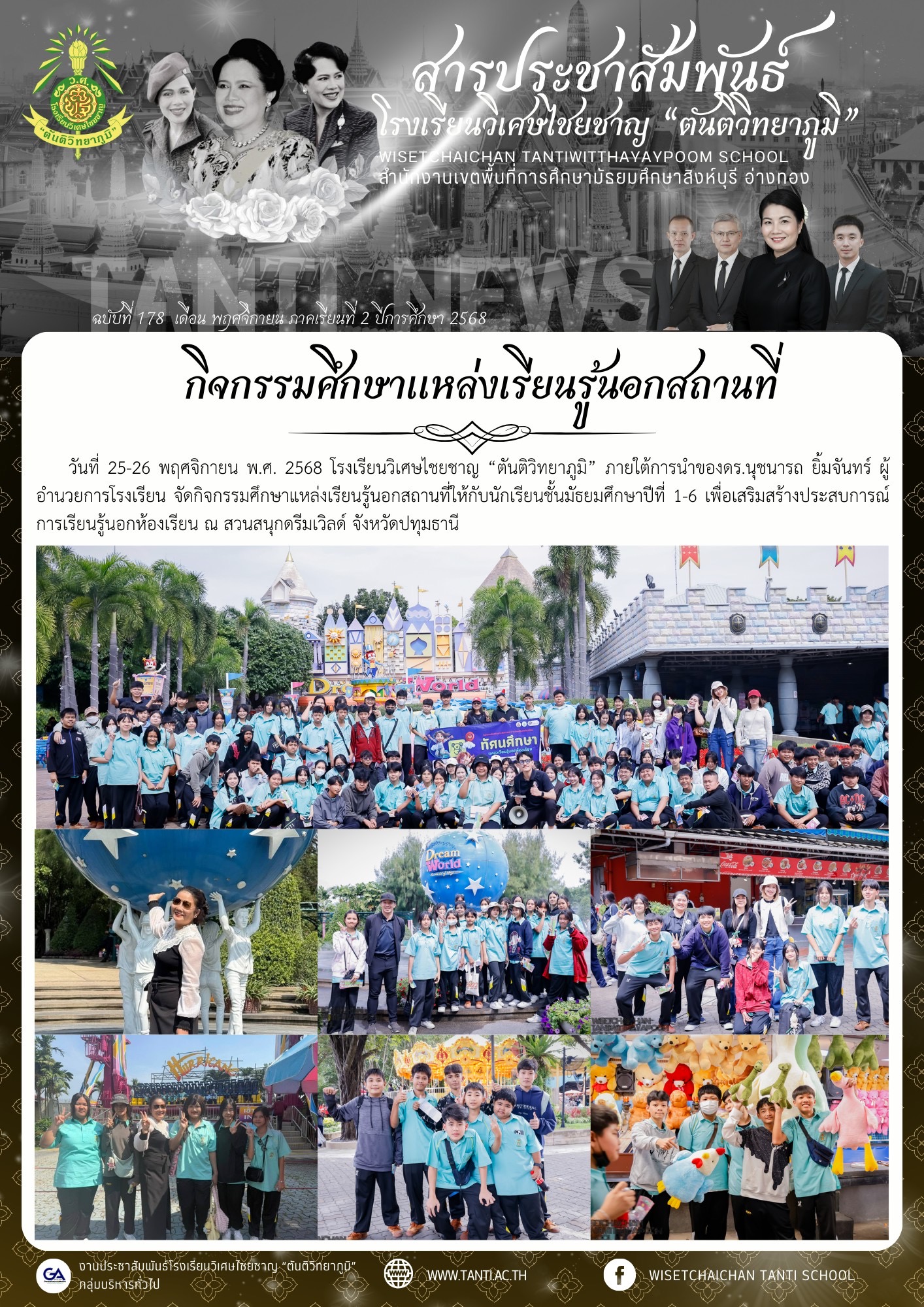 วันที่ 25-26 พฤศจิกายน พ.ศ. 2568 โรงเรียนวิเศษไชยชาญ “ตันติวิทยาภูมิ” ภายใต้การนำของดร.นุชนารถ ยิ้มจันทร์ ผู้อำนวยการโรงเรียน จัดกิจกรรมศึกษาแหล่งเรียนรู้นอกสถานที่ให้กับนักเรียนชั้นมัธยมศึกษาปีที่ 1-6 เพื่อเสริมสร้างประสบการณ์การเรียนรู้นอกห้องเรียน ณ สวนสนุกดรีมเวิลด์ จังหวัดปทุมธานี