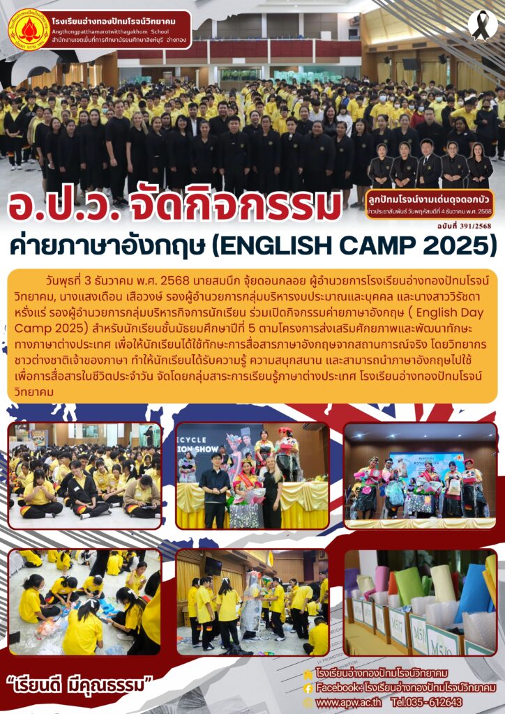 วันพุธที่ 3 ธันวาคม พ.ศ. 2568 นายสมนึก จุ้ยดอนกลอย ผู้อำนวยการโรงเรียนอ่างทองปัทมโรจน์วิทยาคม, นางแสงเดือน เสือวงษ์ รองผู้อำนวยการกลุ่มบริหารงบประมาณและบุคคล และนางสาววิรัชดา หรั่งแร่ รองผู้อำนวยการกลุ่มบริหารกิจการนักเรียน ร่วมเปิดกิจกรรมค่ายภาษาอังกฤษ ( English Day Camp 2025) สำหรับนักเรียนชั้นมัธยมศึกษาปีที่ 5 ตามโครงการส่งเสริมศักยภาพและพัฒนาทักษะทางภาษาต่างประเทศ เพื่อให้นักเรียนได้ใช้ทักษะการสื่อสารภาษาอังกฤษจากสถานการณ์จริง โดยวิทยากรชาวต่างชาติเจ้าของภาษา ทำให้นักเรียนได้รับความรู้ ความสนุกสนาน และสามารถนำภาษาอังกฤษไปใช้เพื่อการสื่อสารในชีวิตประจำวัน จัดโดยกลุ่มสาระการเรียนรู้ภาษาต่างประเทศ โรงเรียนอ่างทองปัทมโรจน์วิทยาคม