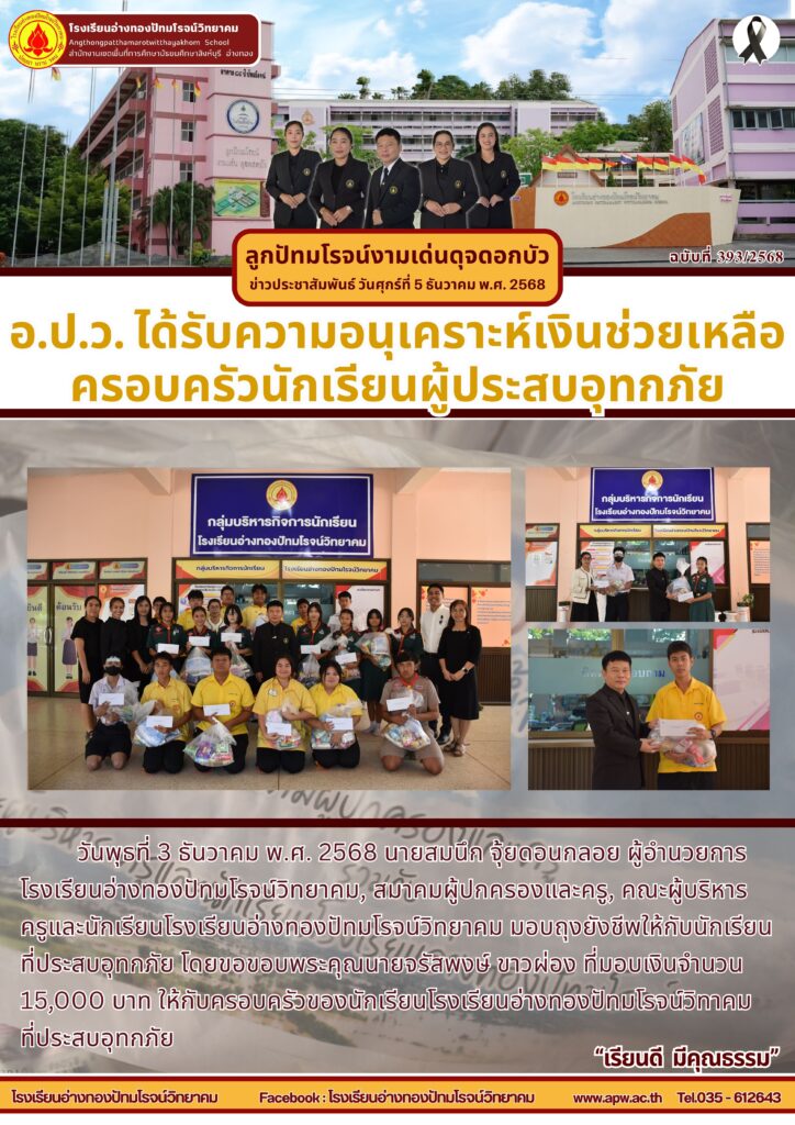 วันพุธที่ 3 ธันวาคม พ.ศ. 2568 นายสมนึก จุ้ยดอนกลอย ผู้อำนวยการโรงเรียนอ่างทองปัทมโรจน์วิทยาคม, สมาคมผู้ปกครองและครู, คณะผู้บริหาร ครูและนักเรียนโรงเรียนอ่างทองปัทมโรจน์วิทยาคม มอบถุงยังชีพให้กับนักเรียนที่ประสบอุทกภัย โดยขอขอบพระคุณนายจรัสพงษ์ ขาวผ่อง ที่มอบเงินจำนวน 15,000 บาท ให้กับครอบครัวของนักเรียนโรงเรียนอ่างทองปัทมโรจน์วิทาคมที่ประสบอุทกภัย