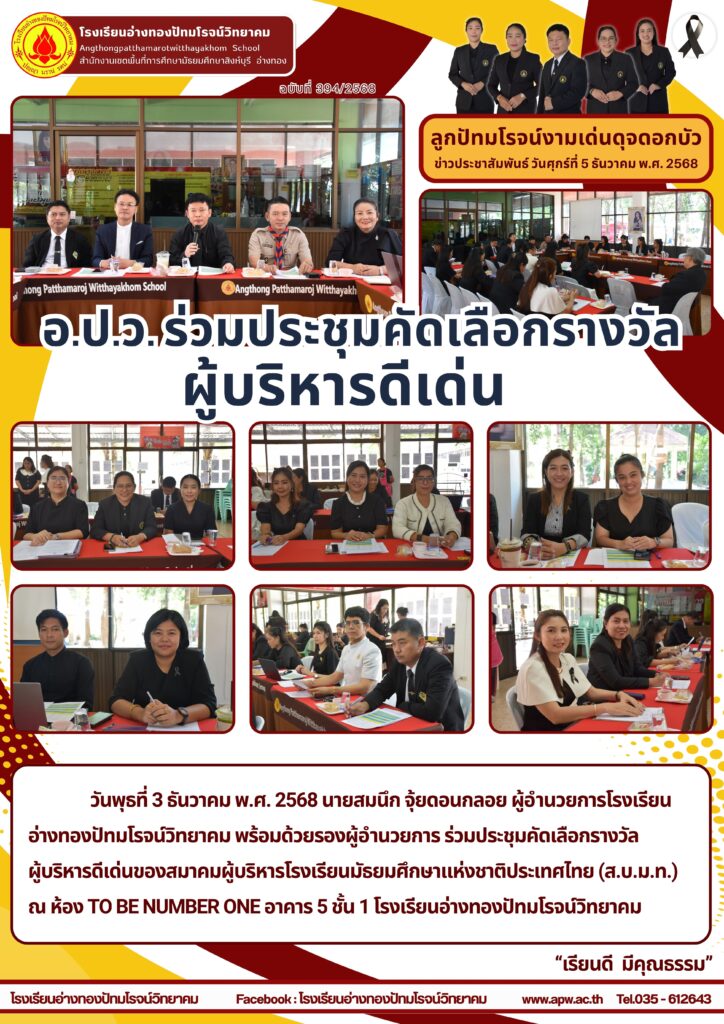 วันพุธที่ 3 ธันวาคม พ.ศ. 2568 นายสมนึก จุ้ยดอนกลอย ผู้อำนวยการโรงเรียนอ่างทองปัทมโรจน์วิทยาคม พร้อมด้วยรองผู้อำนวยการ ร่วมประชุมคัดเลือกรางวัลผู้บริหารดีเด่นของสมาคมผู้บริหารโรงเรียนมัธยมศึกษาแห่งชาติประเทศไทย (ส.บ.ม.ท.) ณ ห้อง TO BE NUMBER ONE อาคาร 5 ชั้น 1 โรงเรียนอ่างทองปัทมโรจน์วิทยาคม